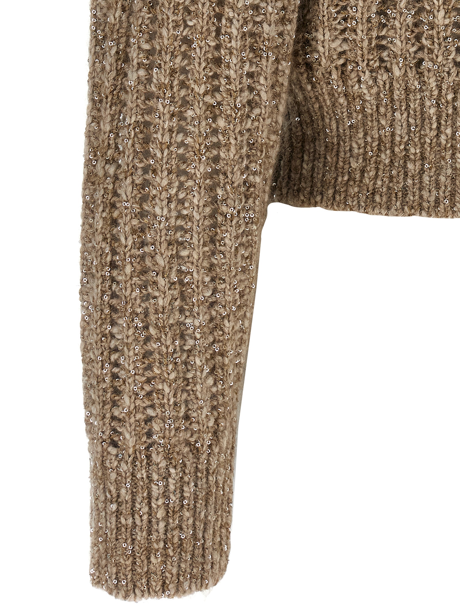 Rustic Dazzling Net’ wool blend cardigan with perforated crochet and all-over sequin appliqué, high neck, front zip closure, long cuffed sleeves.