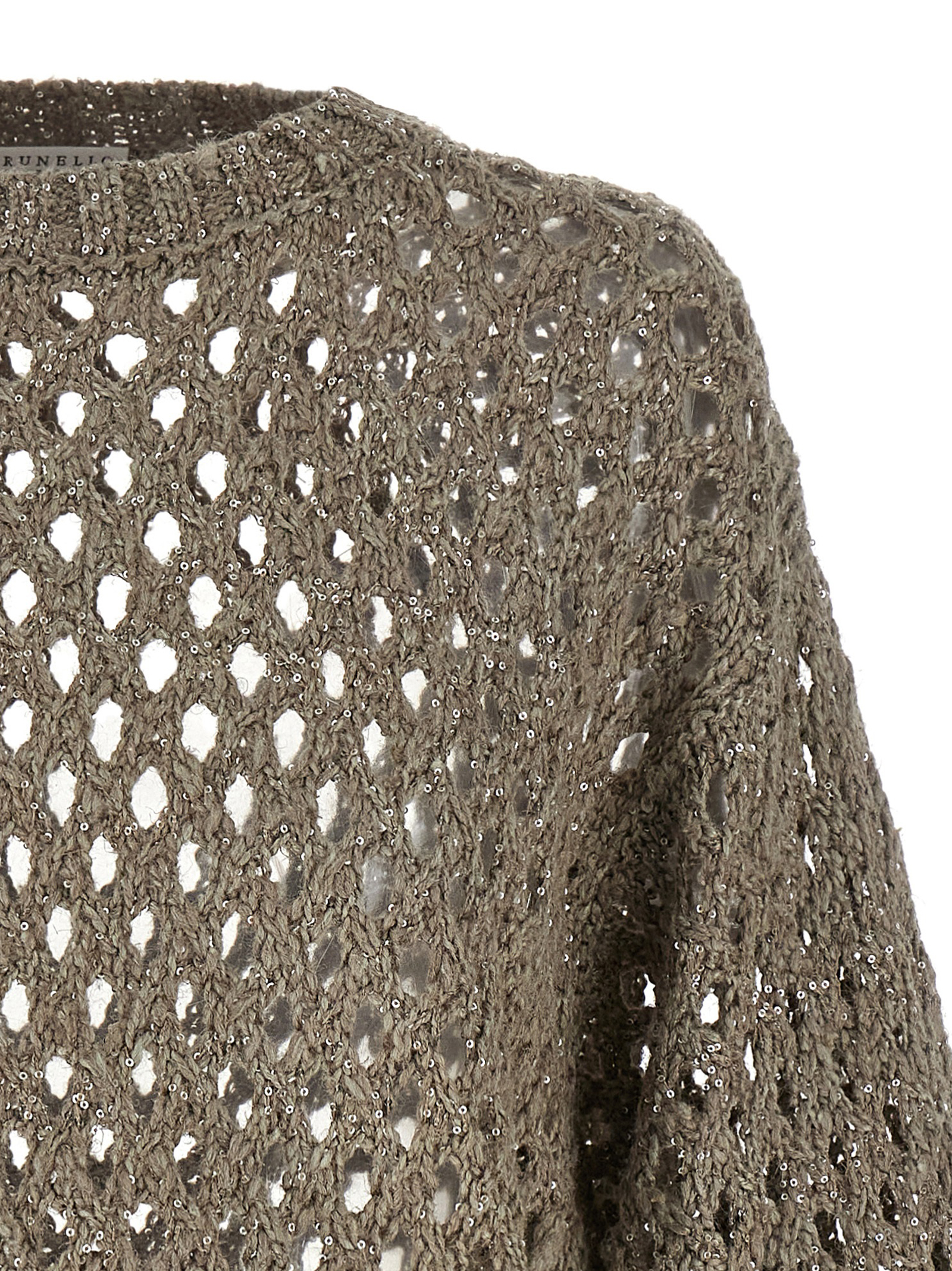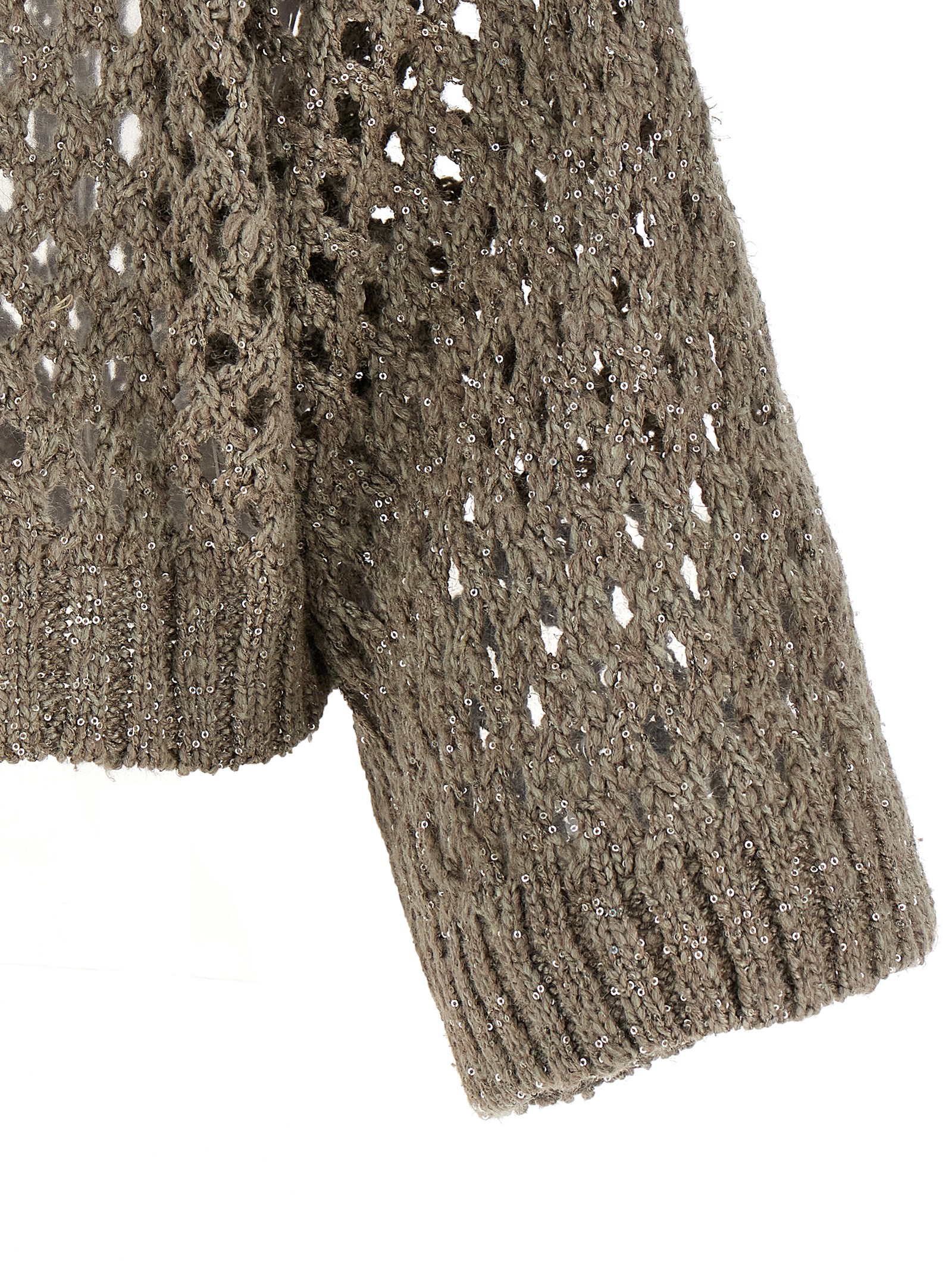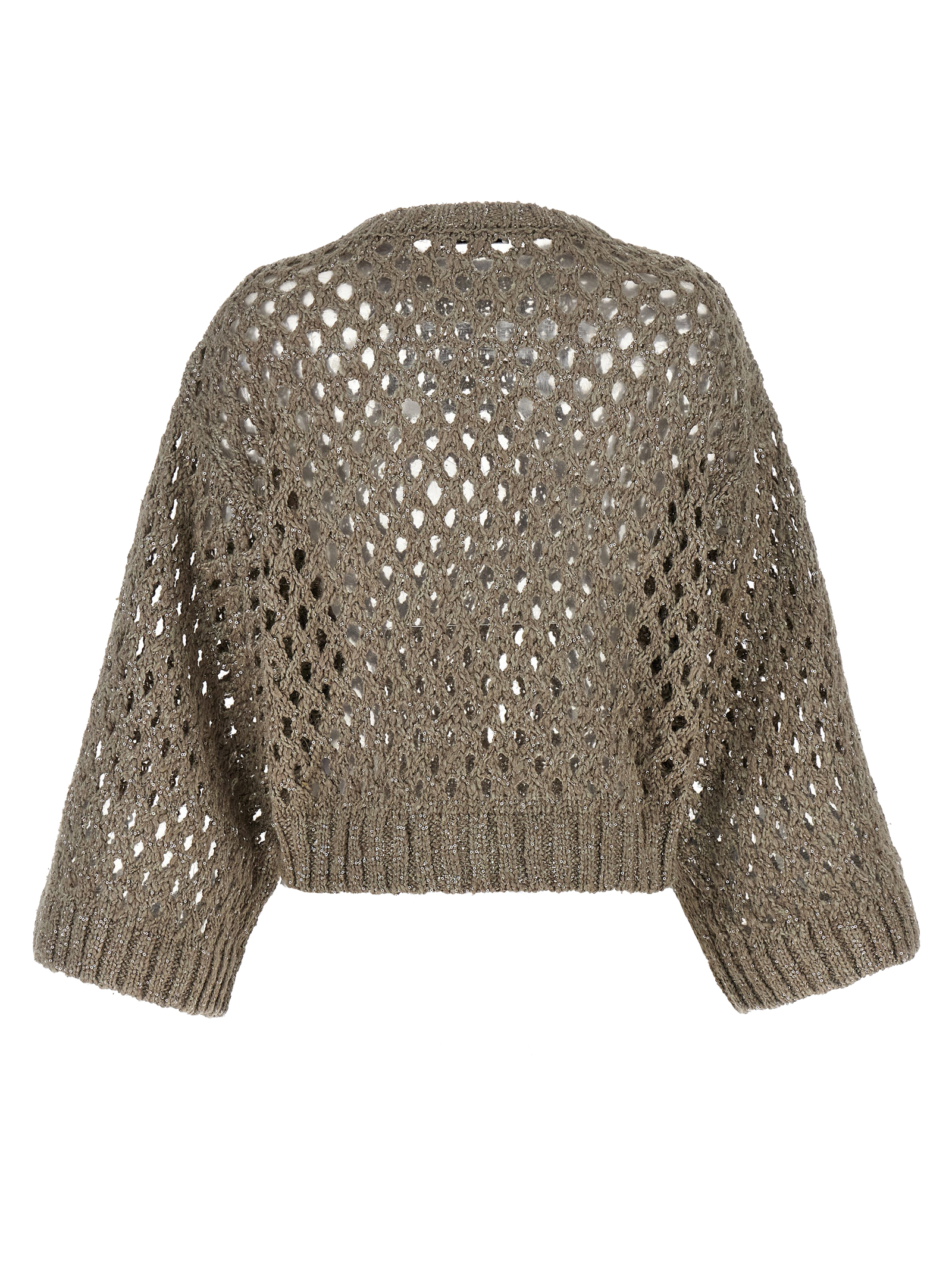 ‘Rustic Dazzling Net’ sweater in silk and linen blend with mesh processing and all-over sequin application, crop model, crew neck, 3/4 sleeves with dropped shoulder.