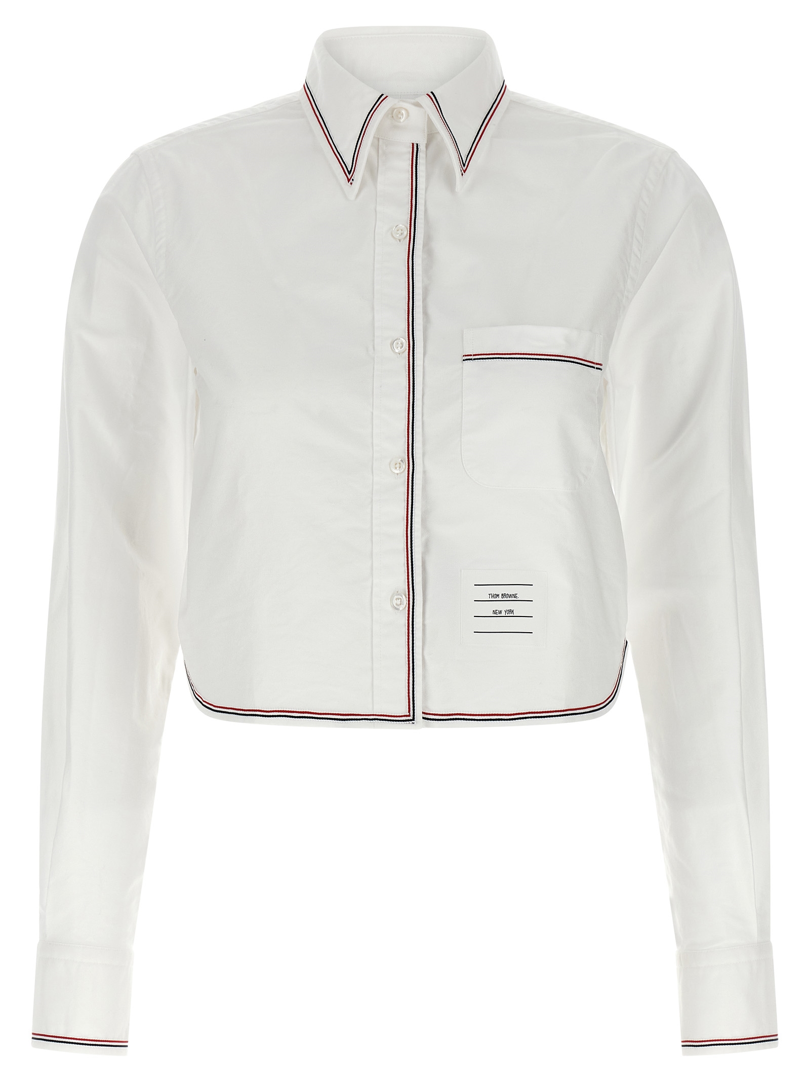 Oxford cotton shirt with ‘RWB’ grosgrain ribbon details, crop style, pointed collar, breast pocket, logo patch and front button closure, long cuffed sleeves.