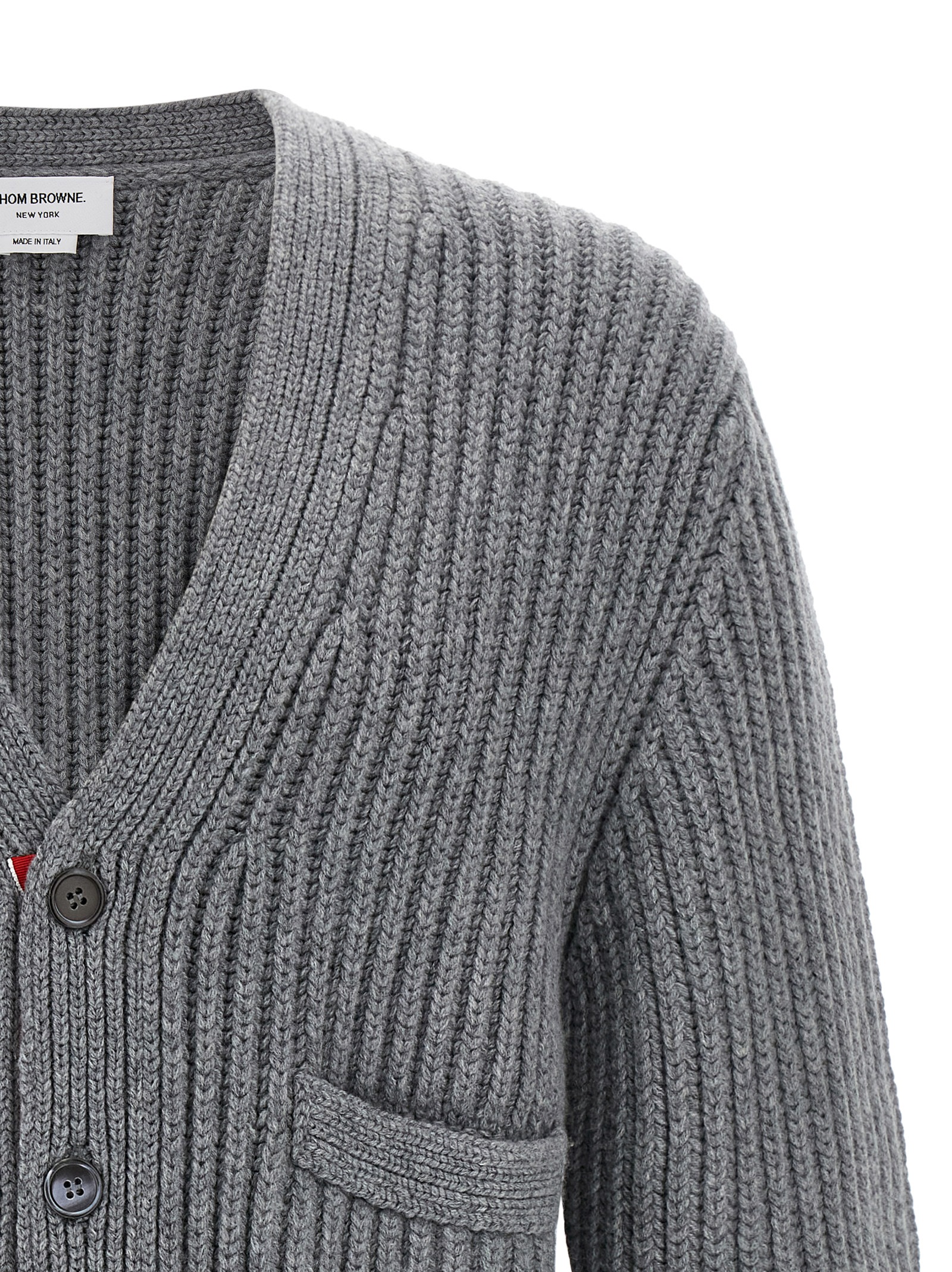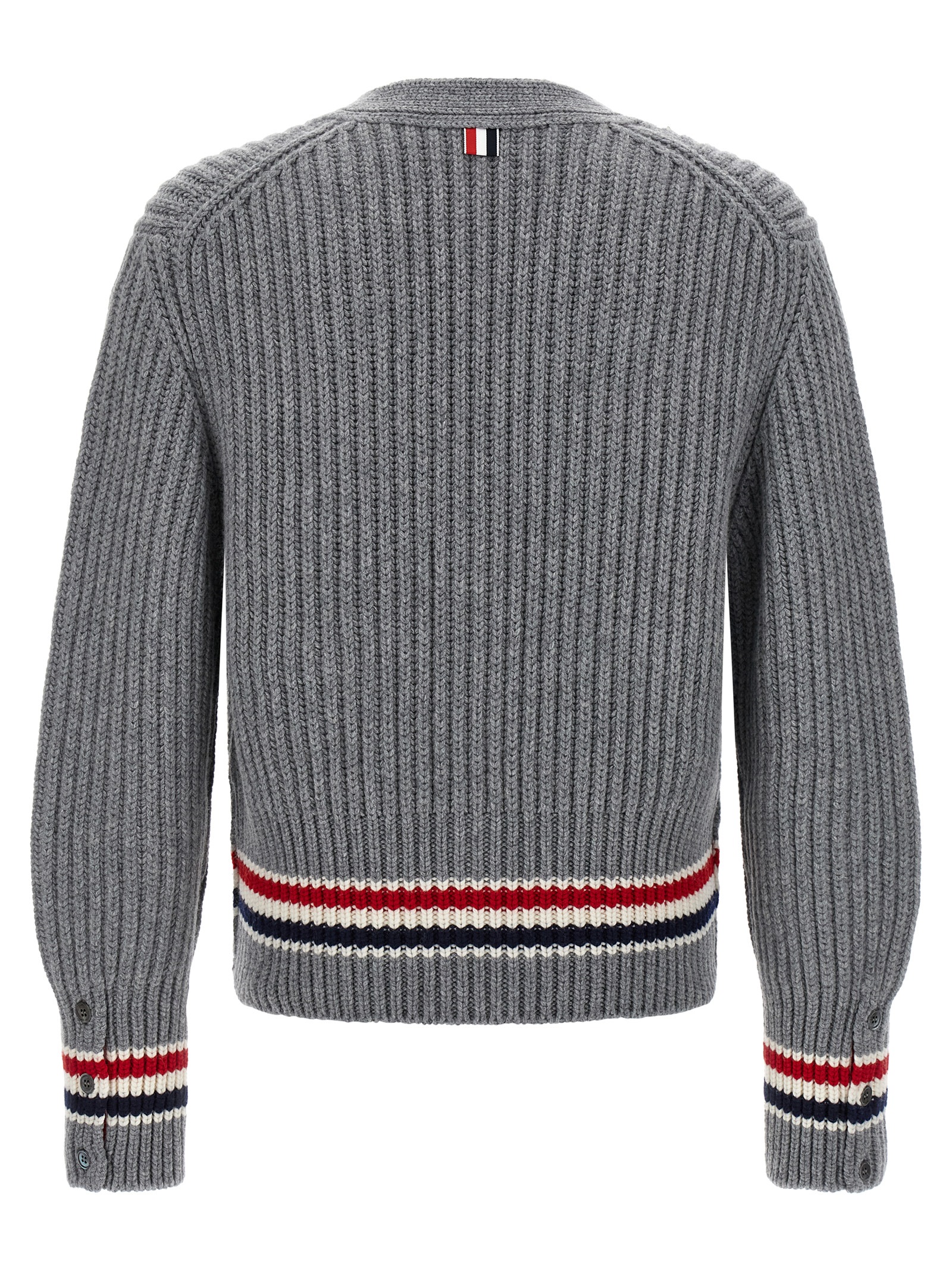 Ribbed cashmere cardigan with RWB inlay tape, V-neck, front button closure, pockets, long cuffed sleeves, side slits with buttons.