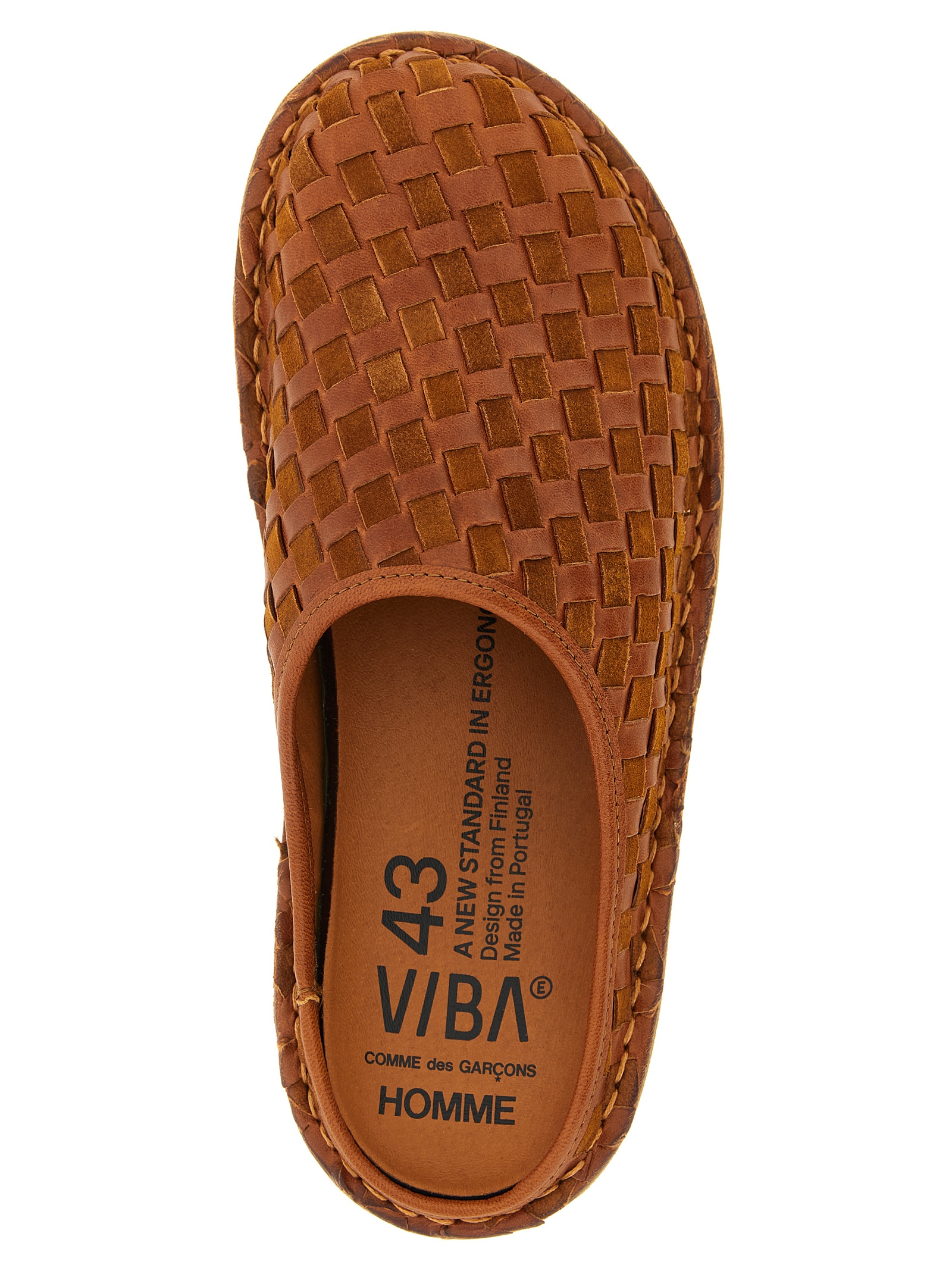 Comme des Garçons Homme x VIBAe ‘Roma’ sabots in brushed suede and luxurious hand-tanned goat leather with tightly woven pattern, slip-on model, construction with Formula 11/14/7, Carbon Step™ antimicrobial anatomical footbed, flexible natural rubber sole.