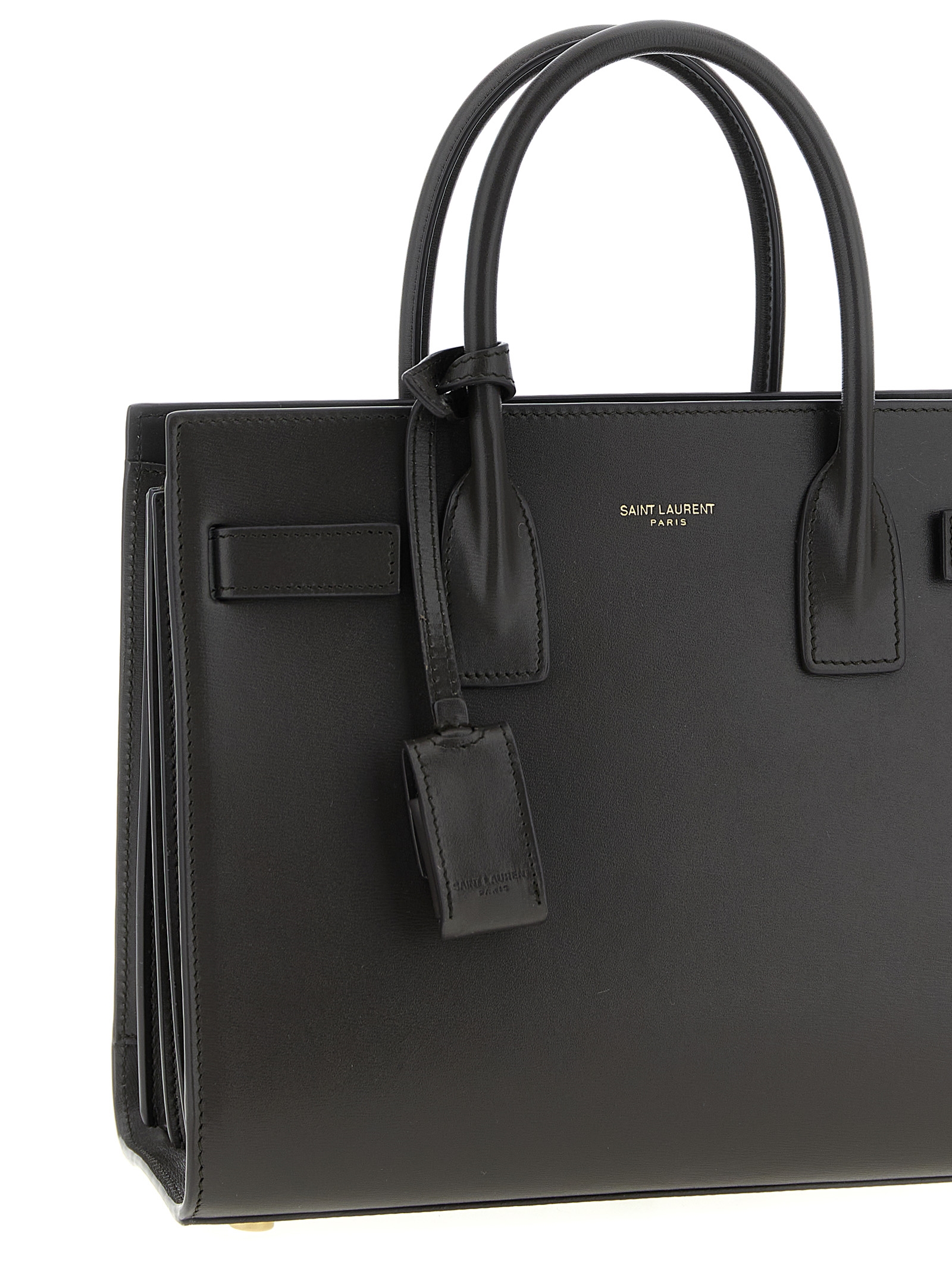 Baby ‘Sac De Jour’ smooth leather handbag with front embossed logo, side gussets with straps, double fixed tubular handle, rigid base with metal feet, removable metal padlock detail, adjustable and removable shoulder strap.