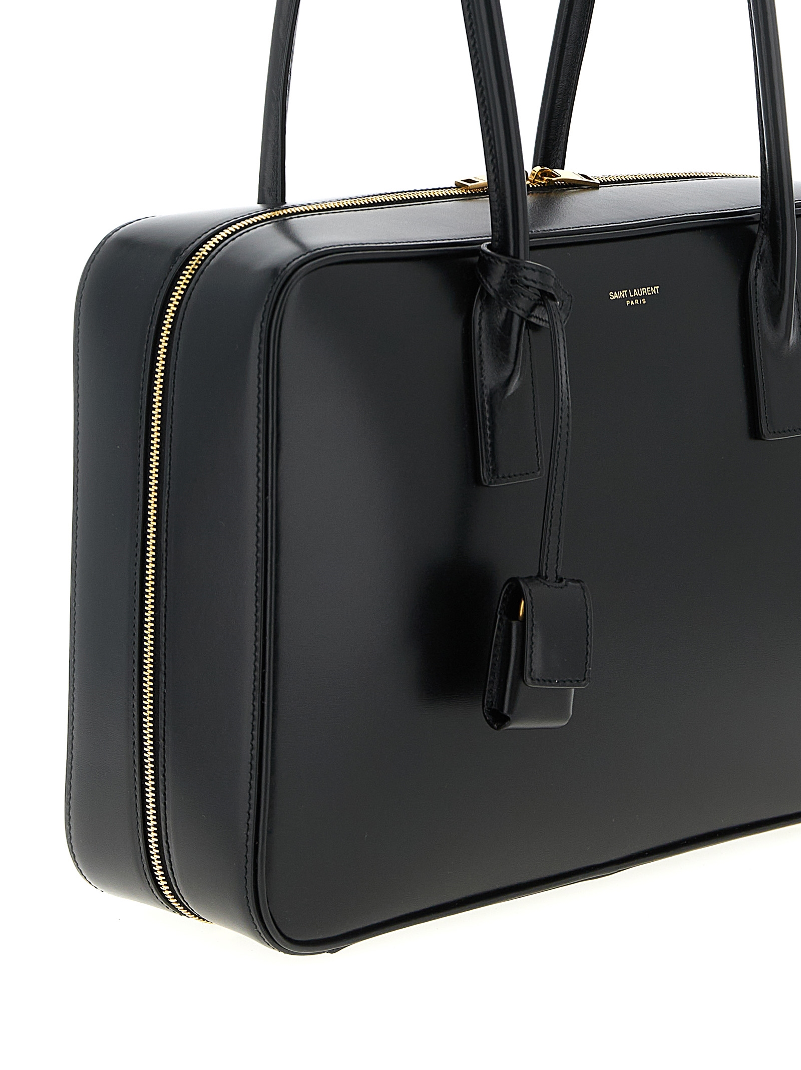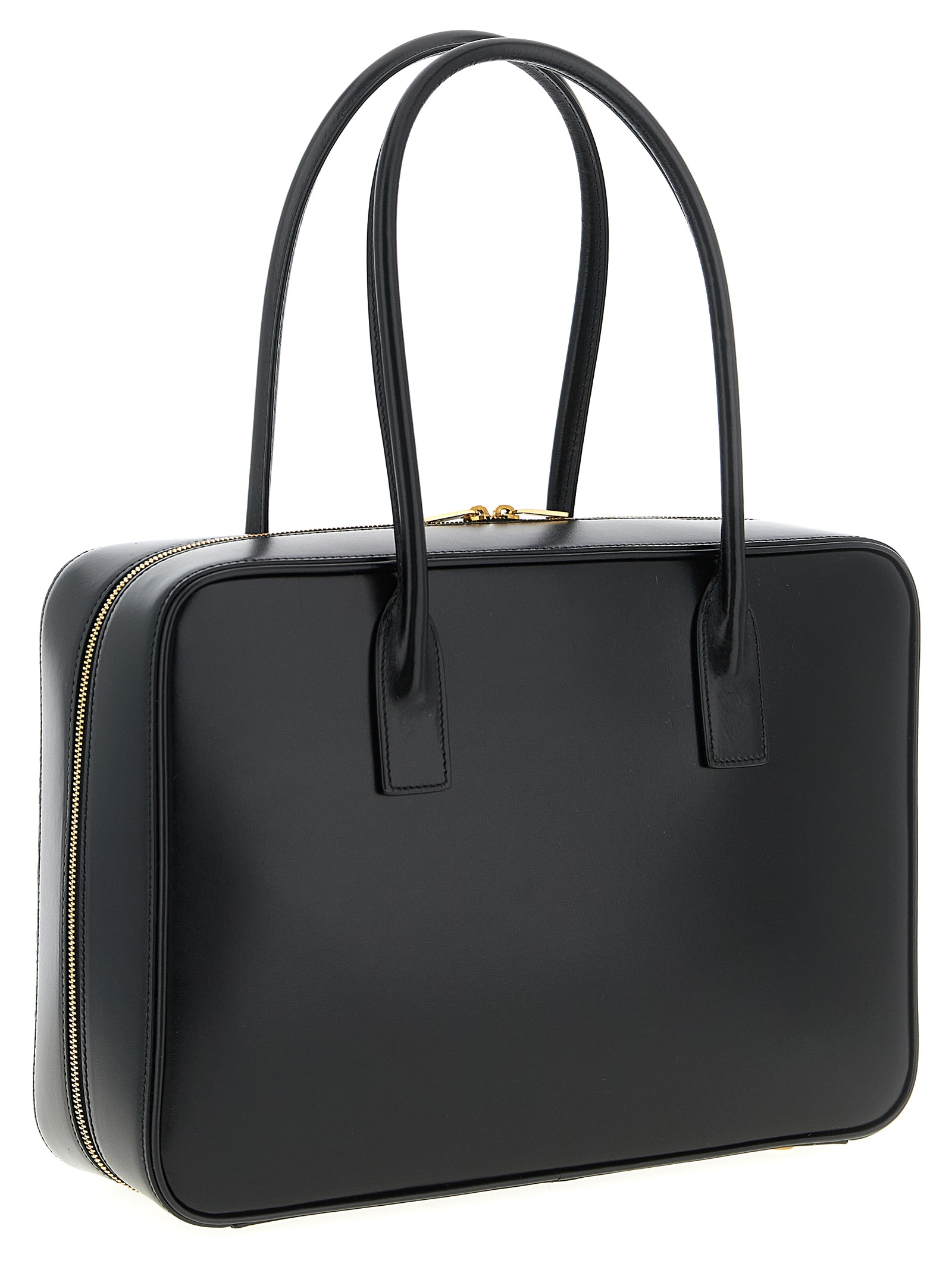 ‘Sac De Jour In Box’ shoulder bag in smooth leather, rectangular top case model, front embossed logo, double fixed tubular handle, rigid base with metal feet, removable metal padlock detail.