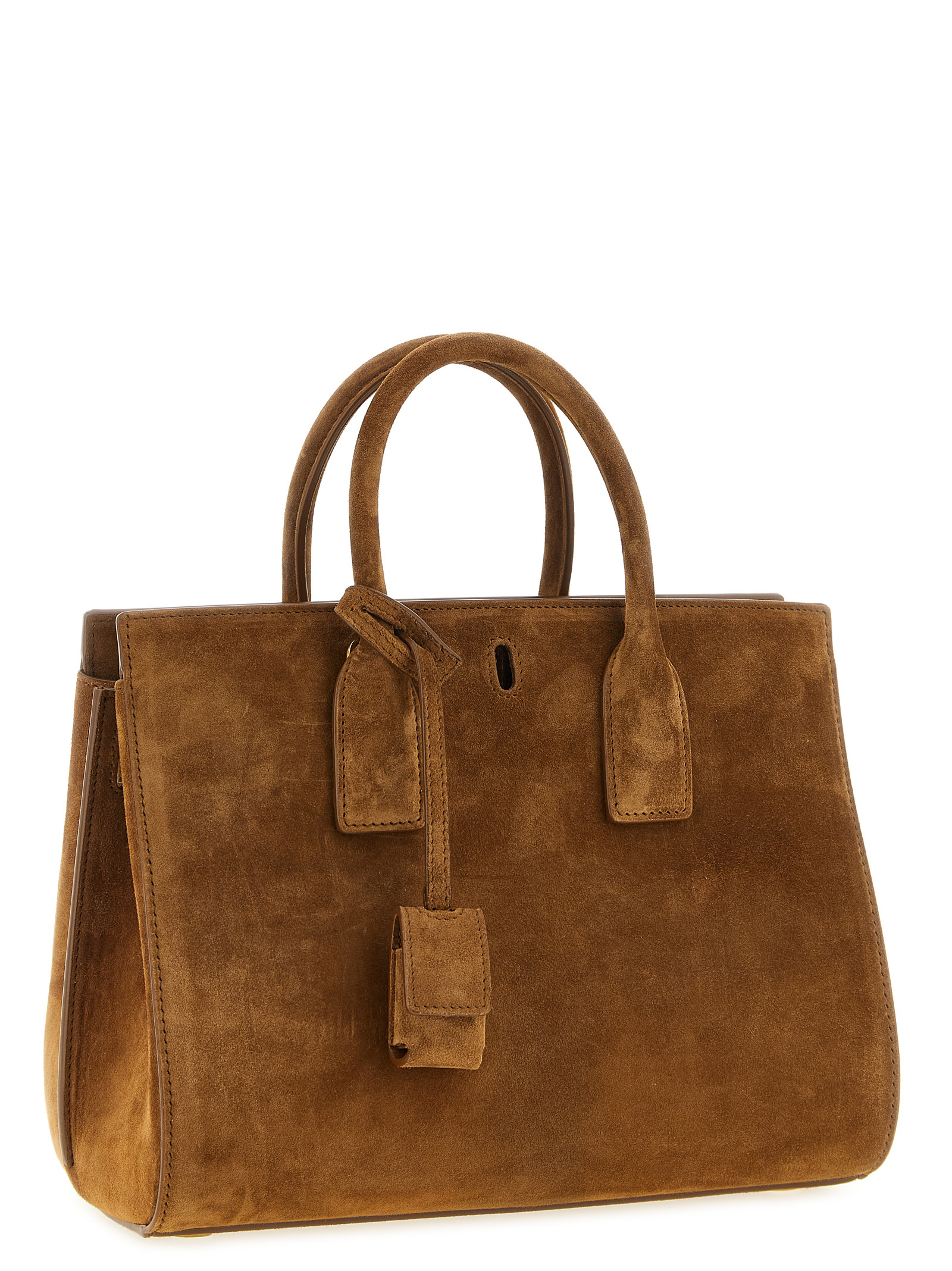 Small ‘Sac De Jour’ suede handbag with East-West design, extendable side gussets with adjustable inner straps, double fixed tubular handle, rigid base with metal feet, removable metal ‘Cassandre’ padlock detail, adjustable and removable leather shoulder strap, adjustable and removable tape shoulder strap.