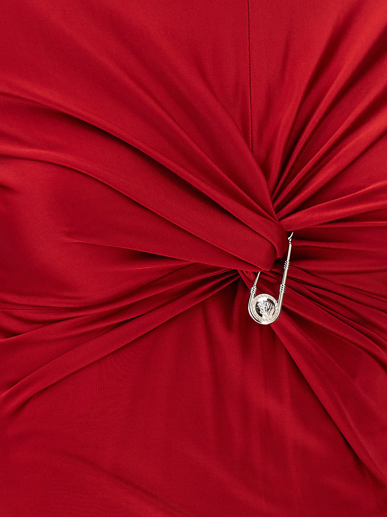 Stretch viscose jersey midi dress with front ‘Safety Pin’ metallic ”, crew neck, back zip closure, long sleeves.