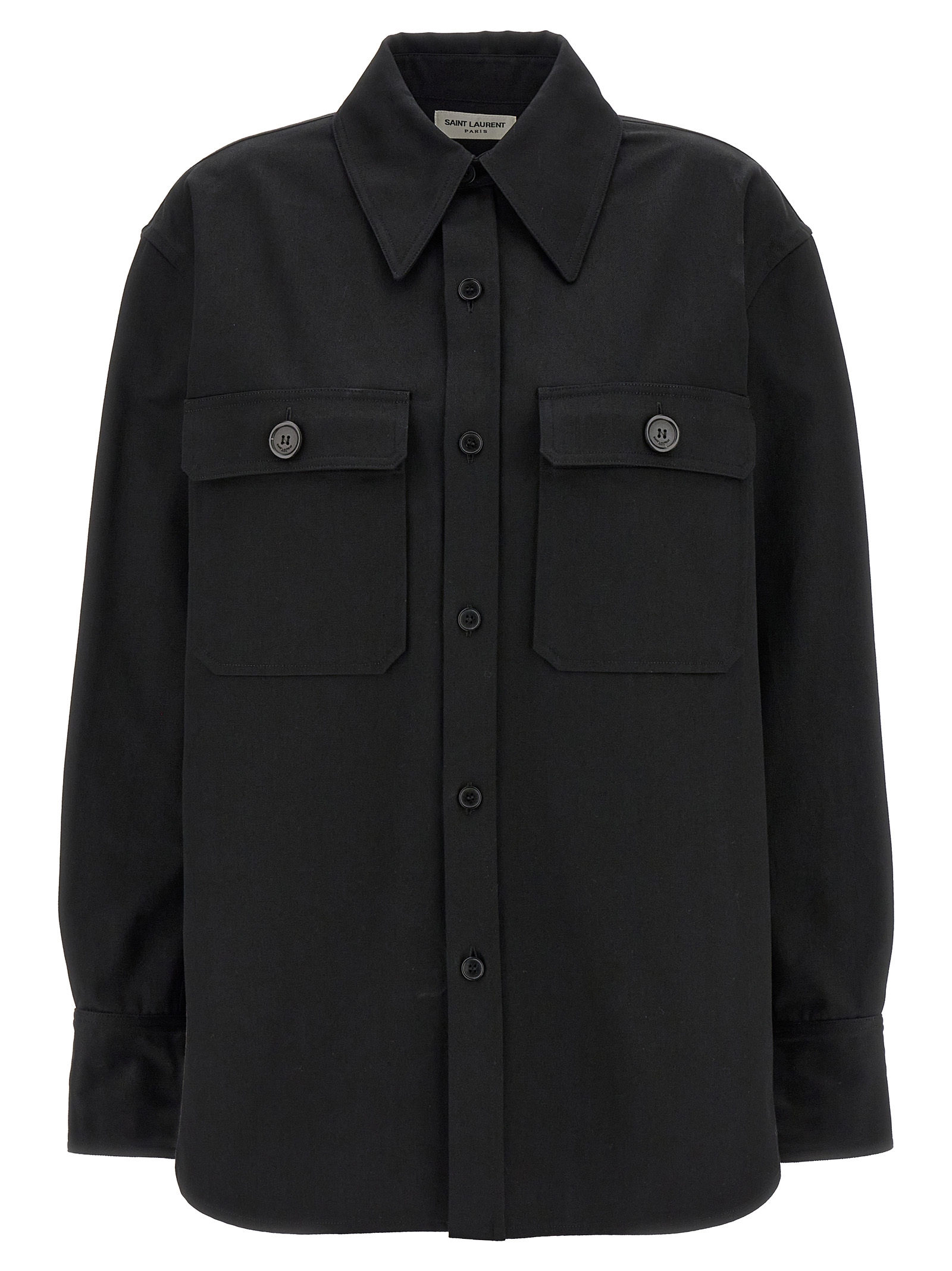 ‘Saharienne’ cotton drill shirt with button closure, pockets, long cuffed sleeves.