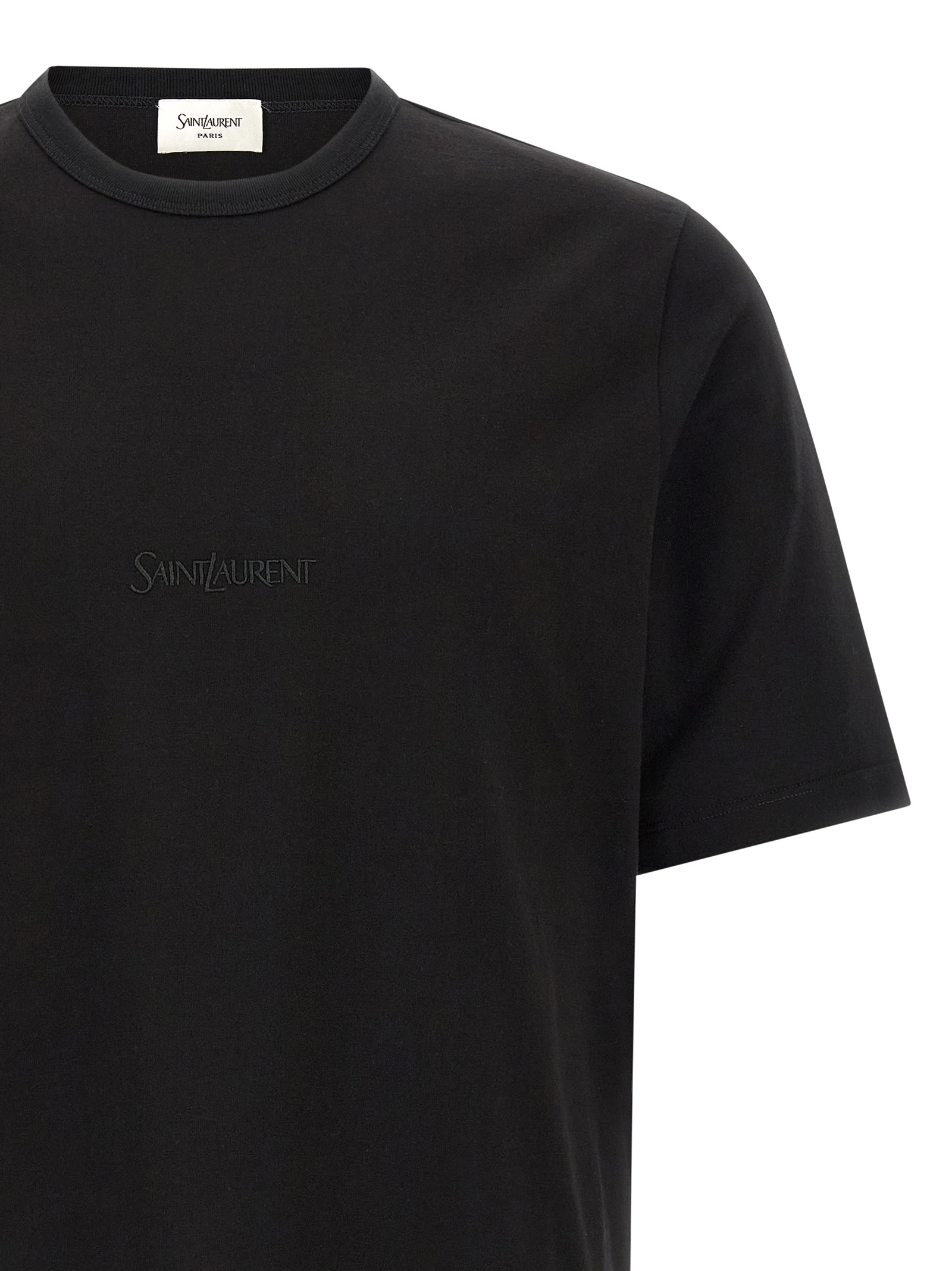 Cotton T-shirt, with tone-on-tone Saint Laurent embroidery on the front, crewneck, short sleeves with dropped shoulders.