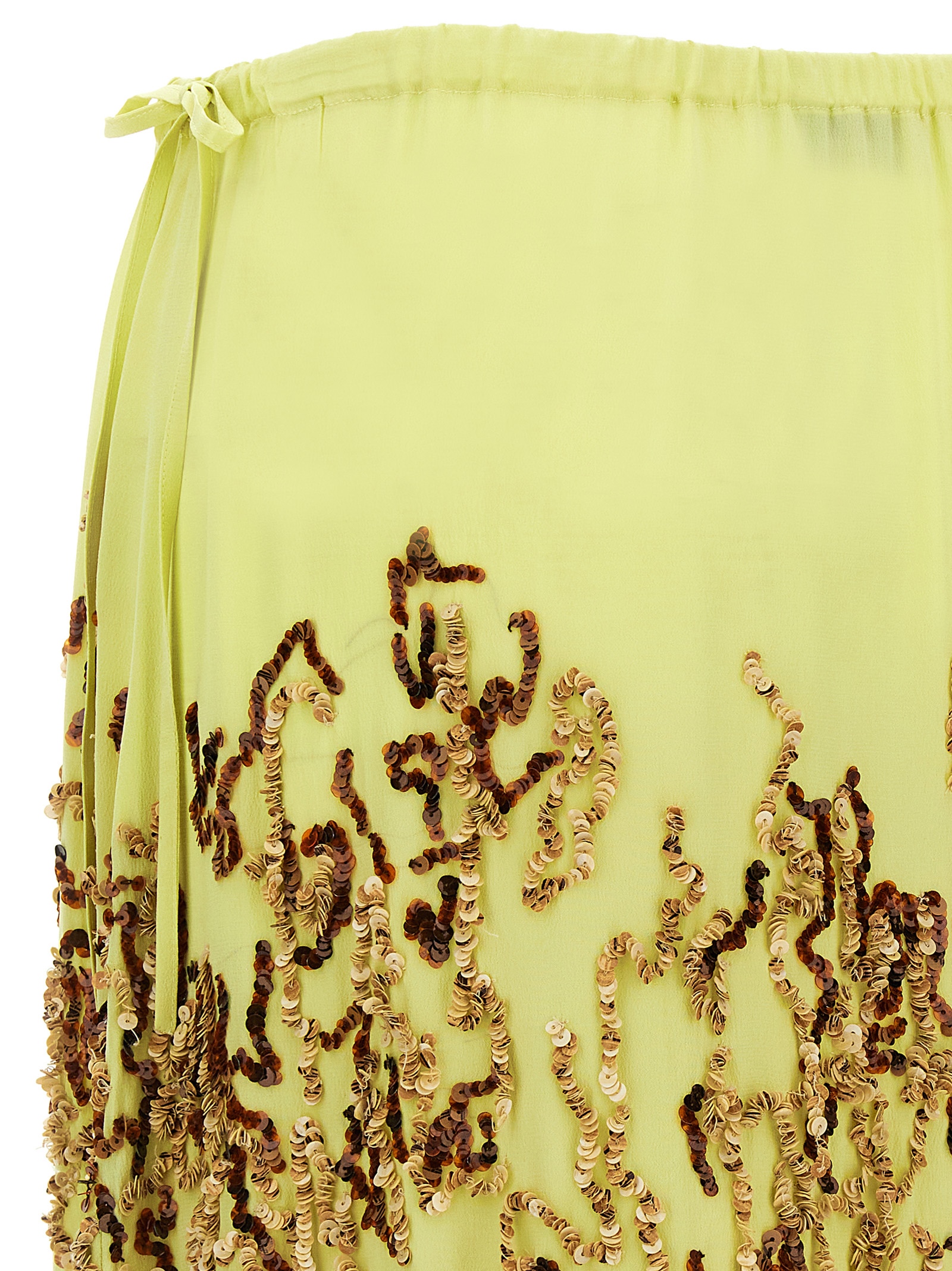 Salga’ silk midi skirt with sequin embroidery, adjustable drawstring at the waist.
