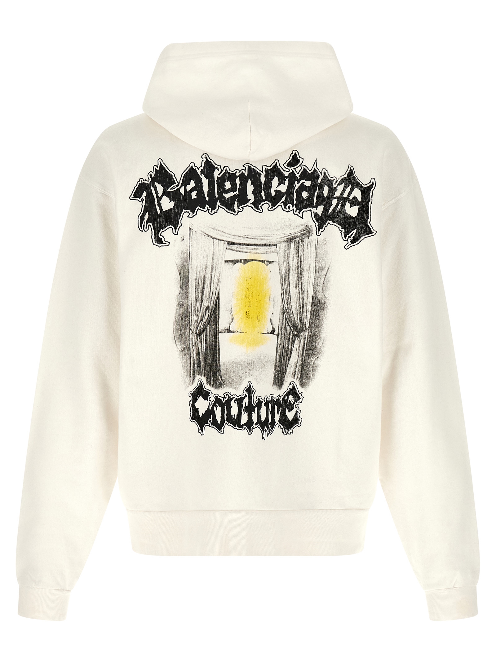 Dry used-effect jersey hoodie with ‘Salon De Couture’ print on the front and back, front zip closure, pockets, long sleeves with cuffs and dropped shoulders, and headband.