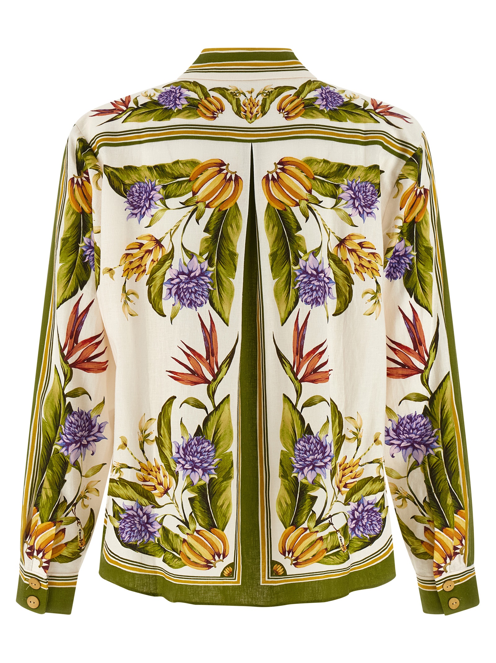 ‘Sand Tropical Scarf’ print Lenzing Ecovero™™ and Euroflax™ blend shirt, pointed collar, front button closure, long cuffed sleeves and rounded hem.