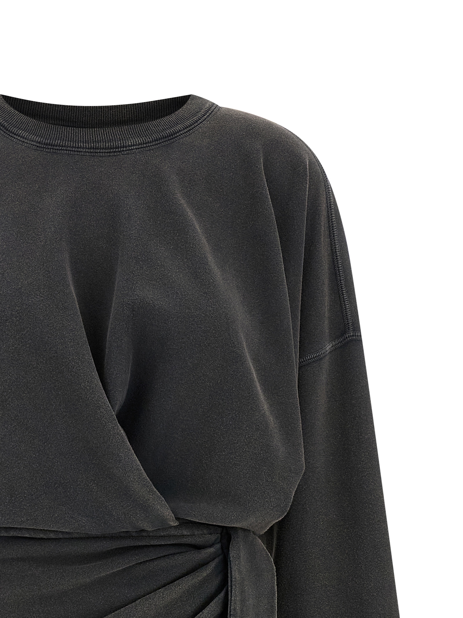 ‘Sandrina’ cotton jersey midi dress consisting of fleece-style top, crew neck, long sleeves with dropped shoulder and cuffs, tone-on-tone back logo embroidery and wrap skirt with closure to tie on the side, central split, asymmetrical hem.