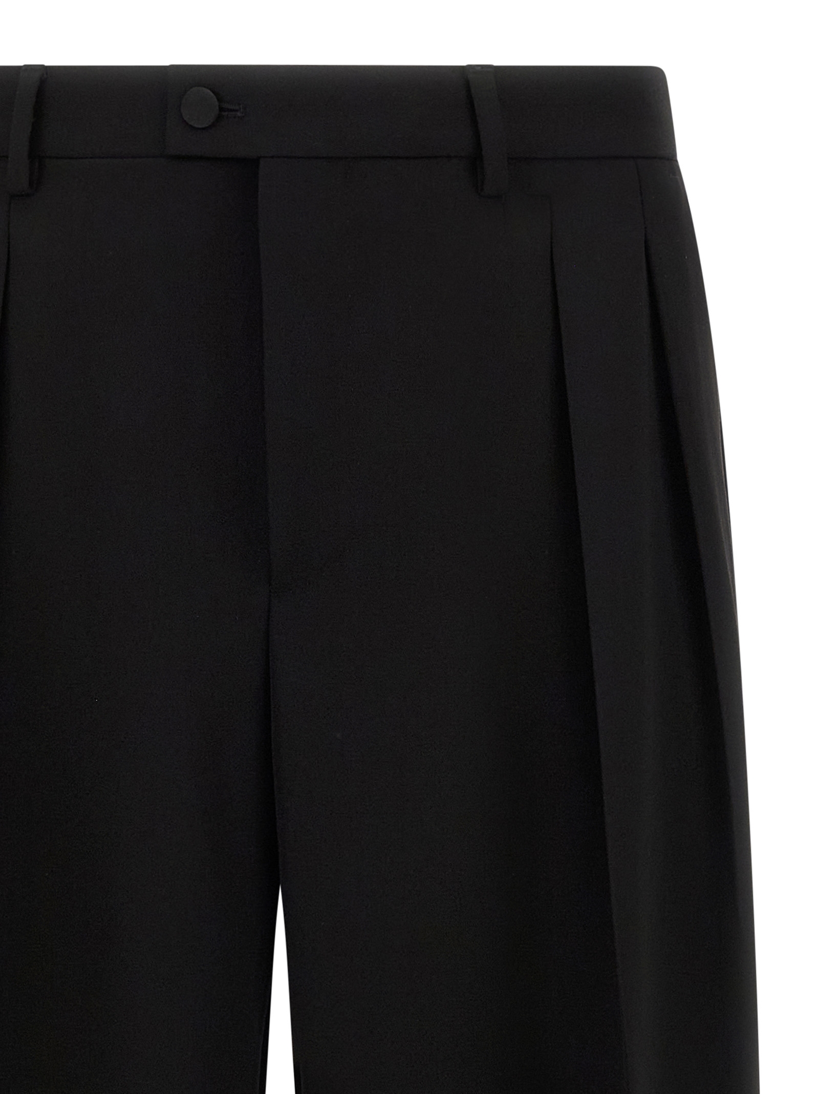 Wool gabardine pants with tone-on-tone satin side bands, pleats, stretched pleat, wide and straight leg, zip and front button closure, pockets.