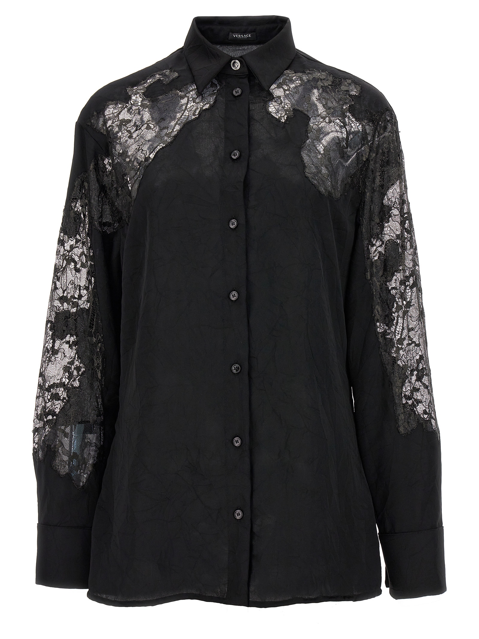 Recycled-effect satin shirt with lace inserts, long cuffed sleeves and a button closure.