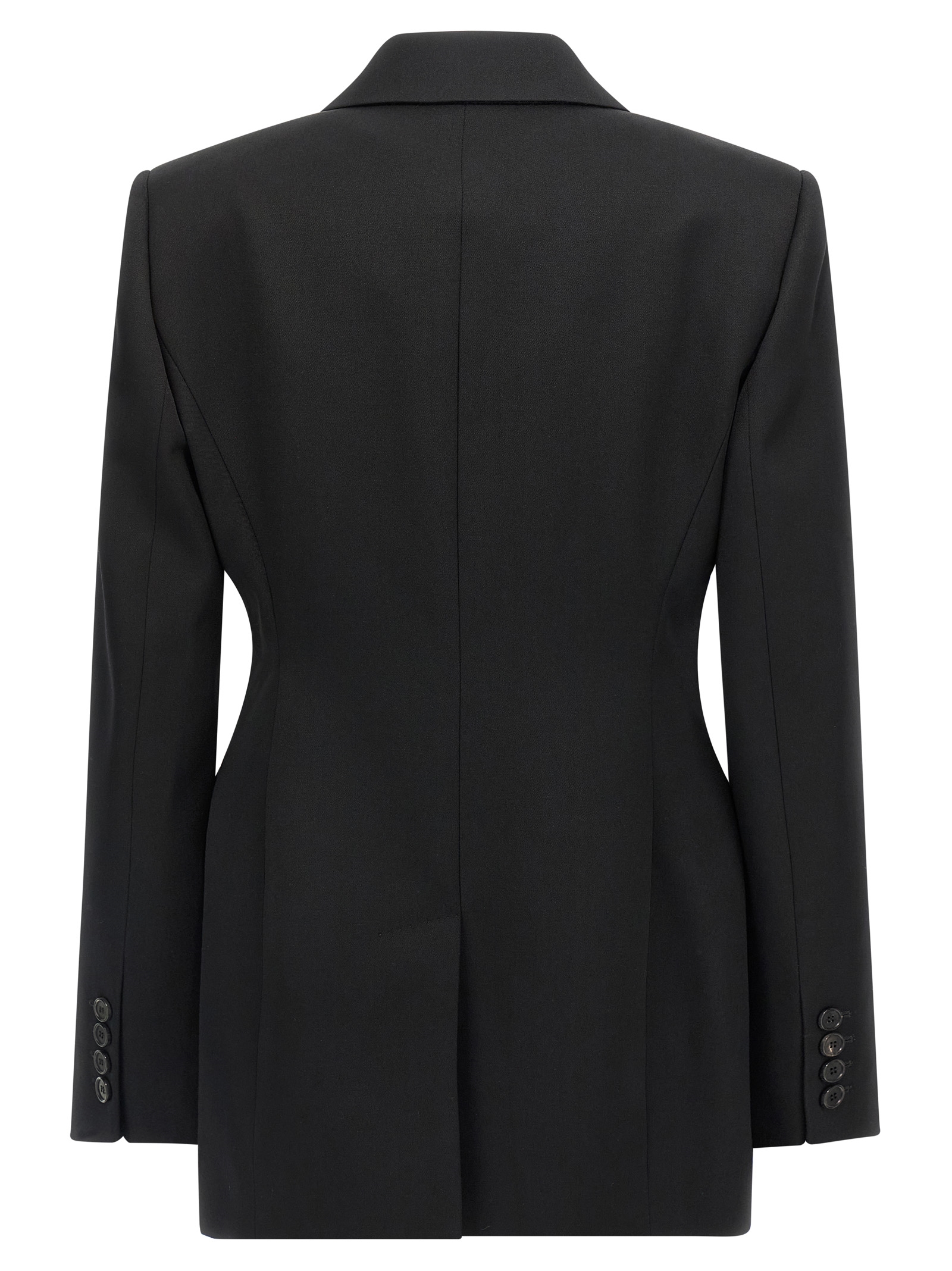 Double-breasted grain de poudre wool blazer with front button closure, hourglass silhouette, tone-on-tone satin peak lapels, breast pocket, flap pockets, padded shoulders, long sleeves, back split, contrast satin lining.