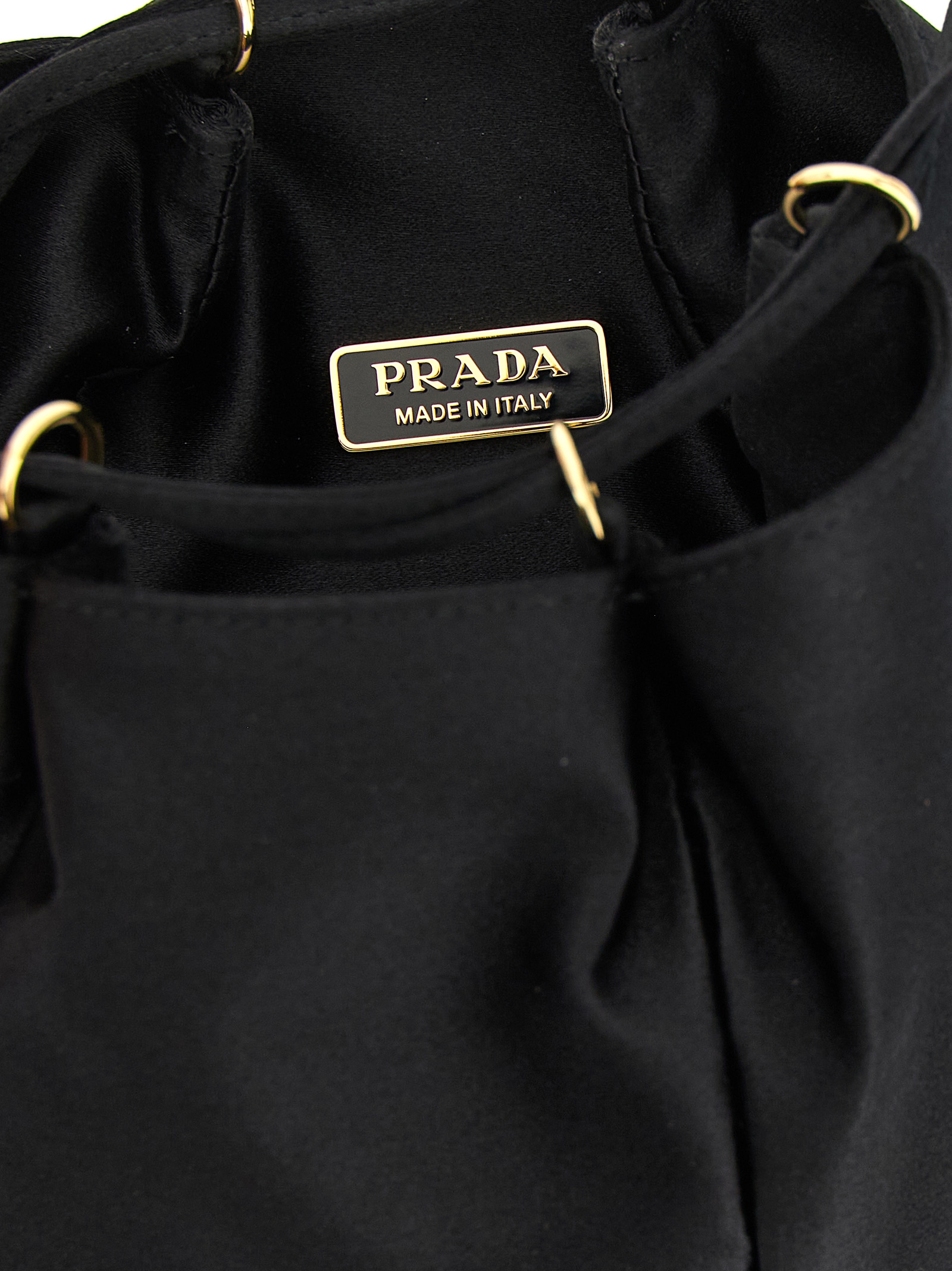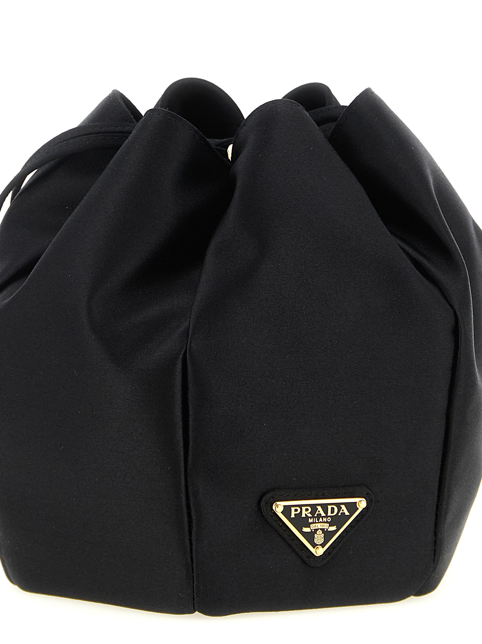 Mini satin bucket bag, triangle logo in front enameled metal, panel construction, double handle that creates the drawstring closure.