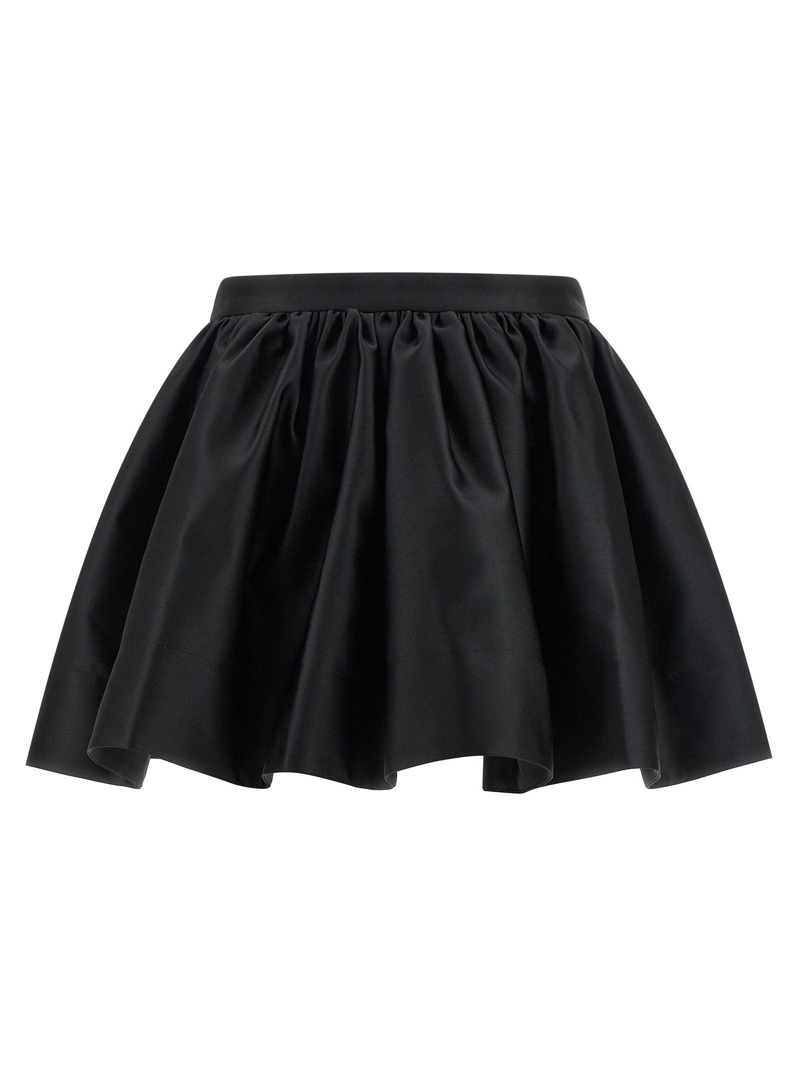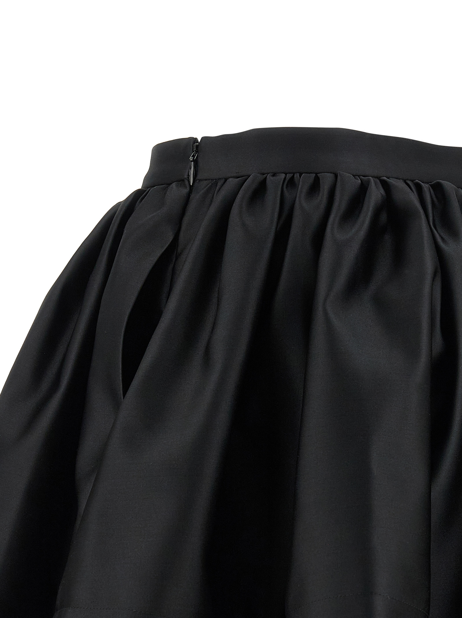Mini satin skirt, viscose lining, balloon style with wide pleats, pockets, side zip closure.