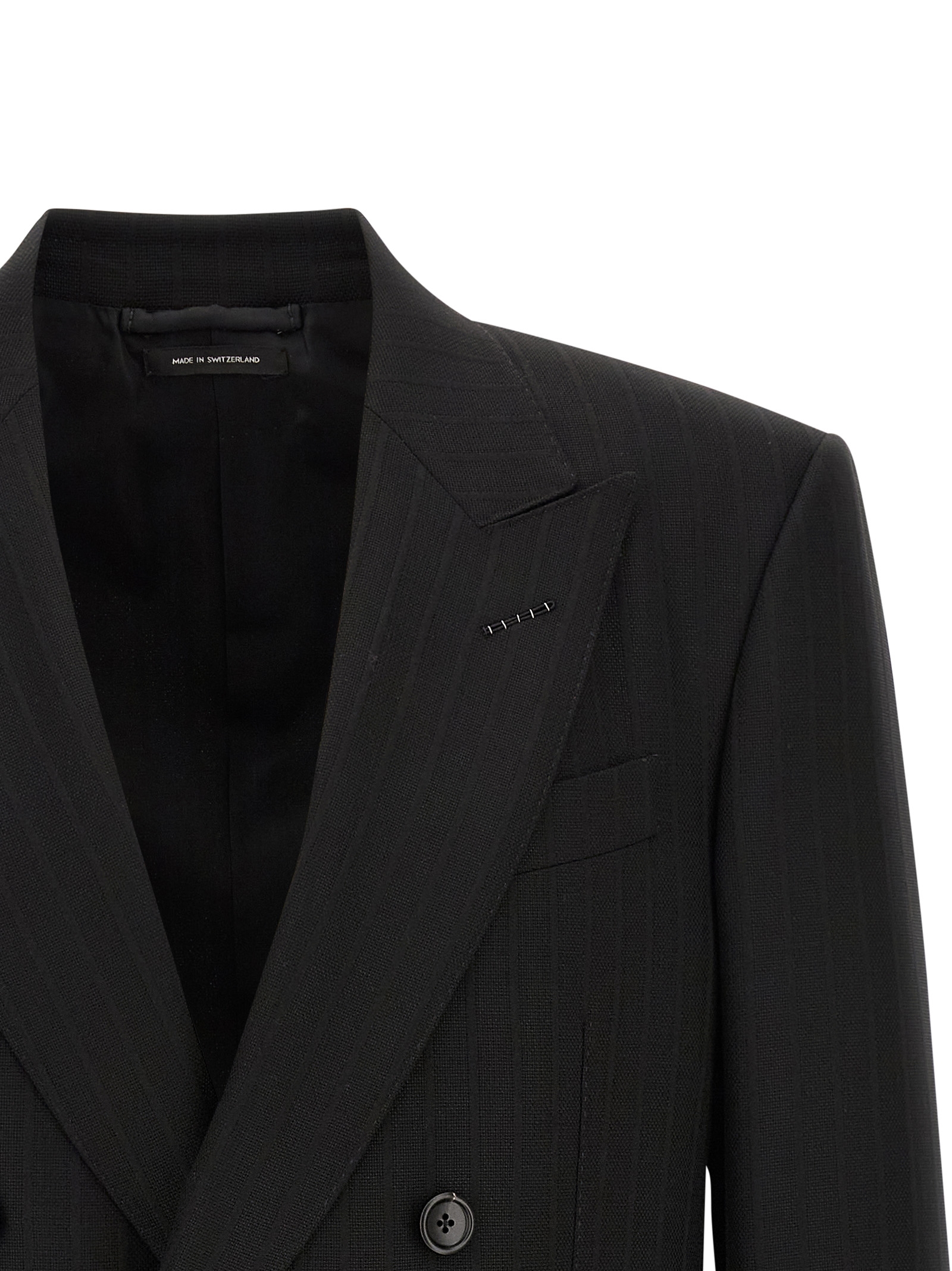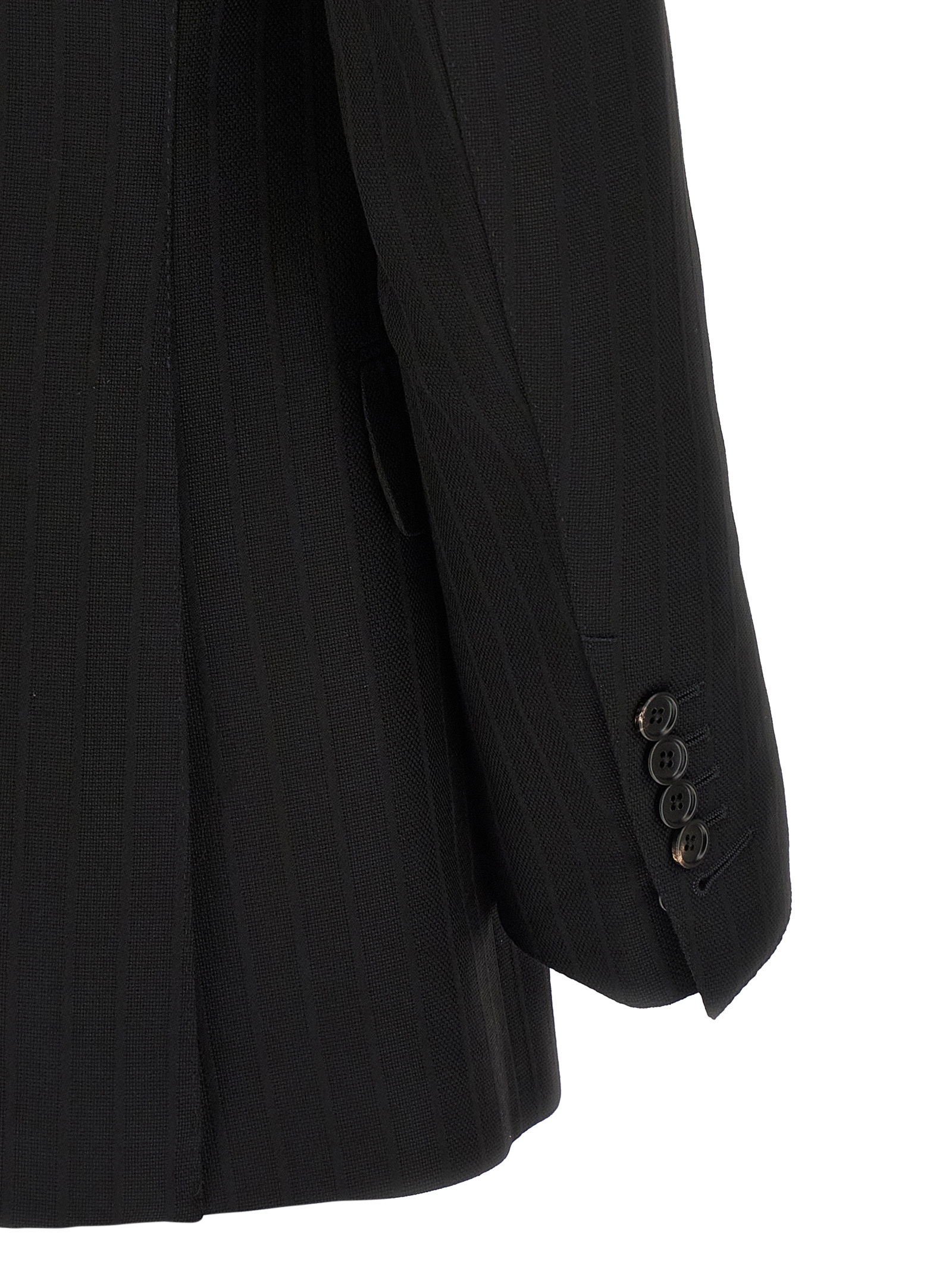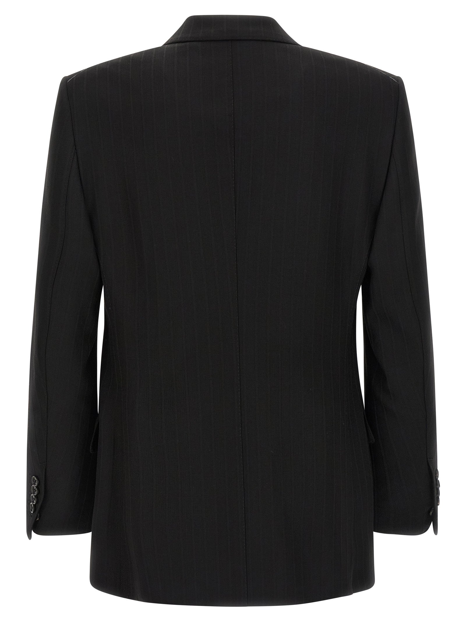 Micro check wool blazer with tone-on-tone pinstriped satin stripes, double-breasted model with front button closure, peak lapels, chest pocket, flap pockets, structured shoulder strap, cuffs with open buttonholes, back slits, lining.