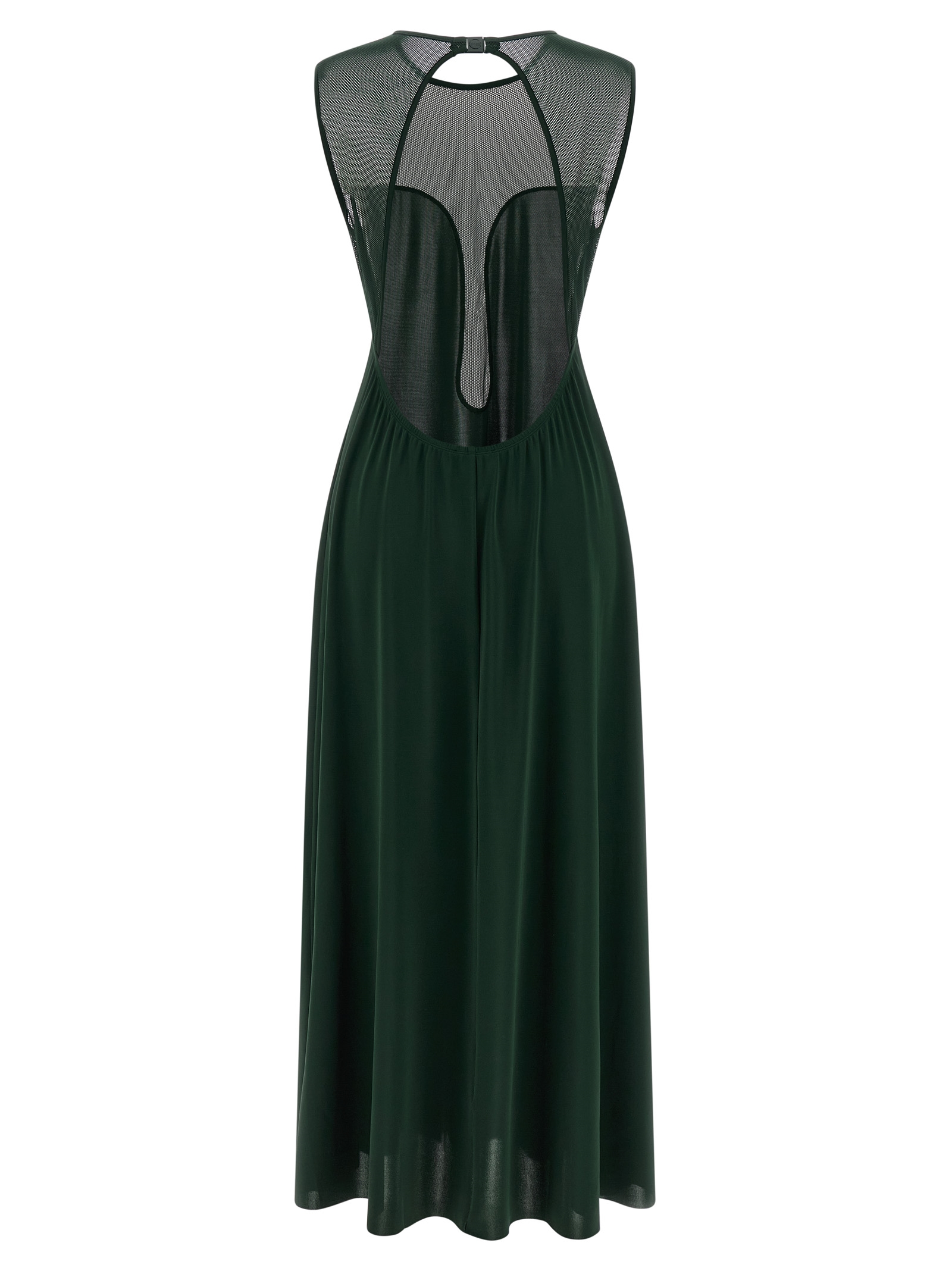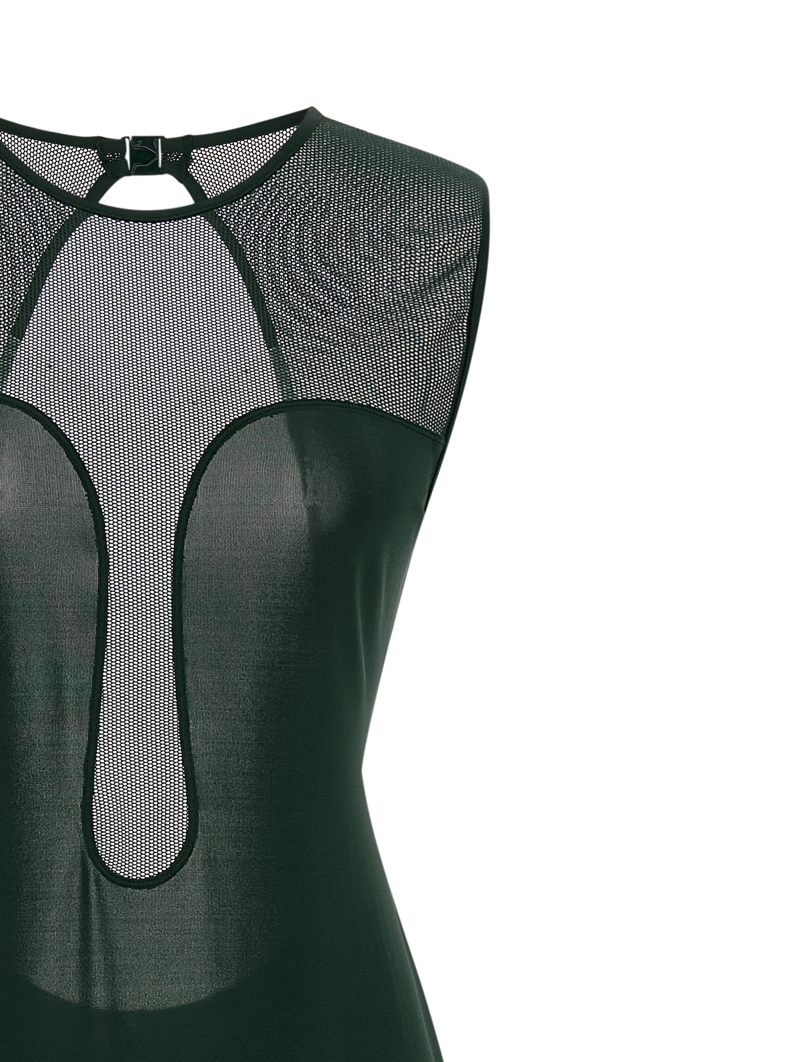 Long ‘Scene’ dress in stretch fabric, crew neck with mesh insert, clip closure, deep back neckline, sleeveless.
