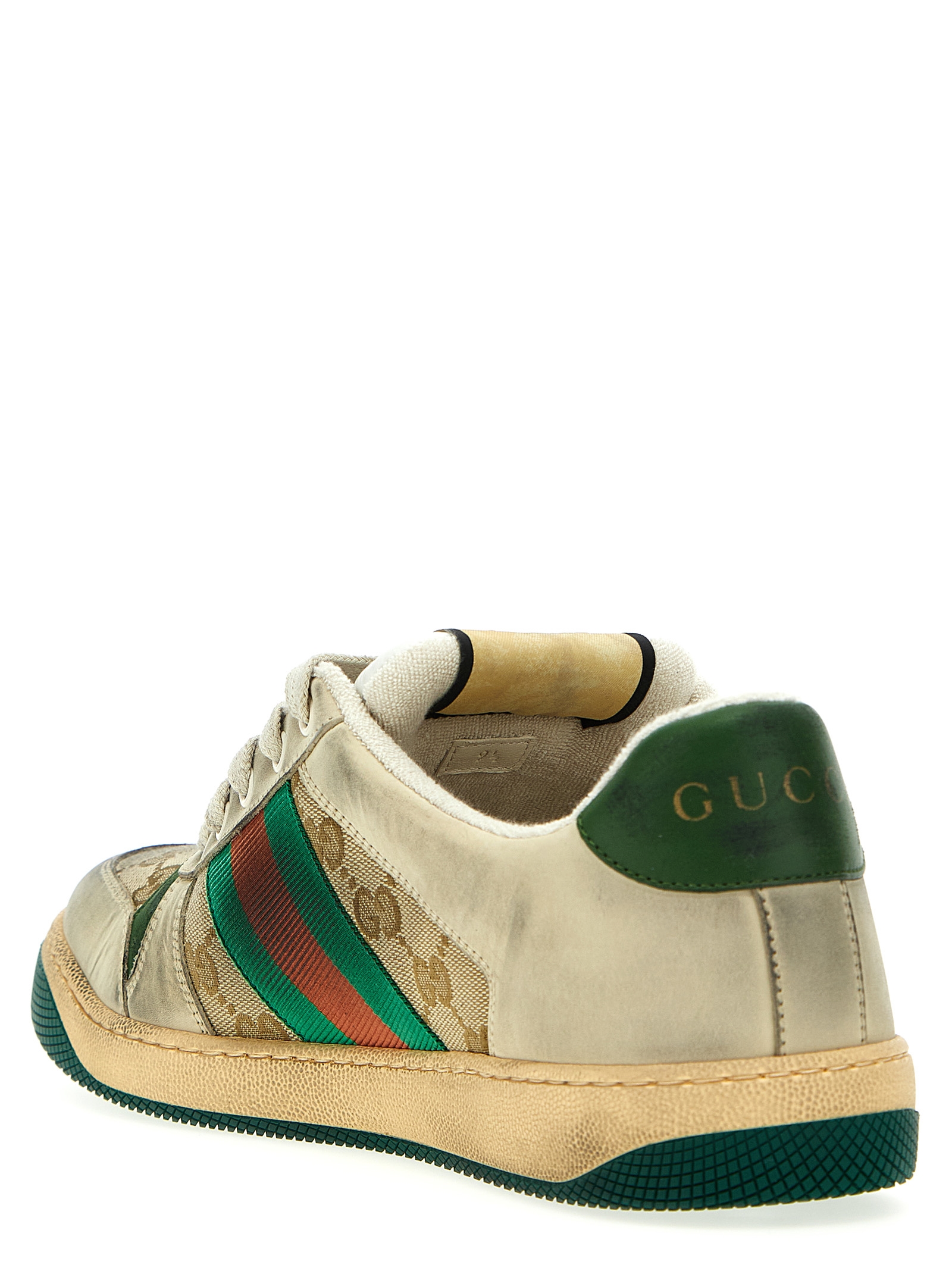 ‘Screener GG’ sneakers in white leather and Original GG fabric, green and orange web ribbon in vintage-effect nylon, green leather details, treated for a vintage and worn effect, enamelled oval detail with Double G in metal, Gucci vintage logo label, two-tone rubber sole, laces. A pastiche of influences from different decades, Gucci shoes feature shapes and materials typical of retro sportswear. Inspired by the classic sneakers of the 70s.