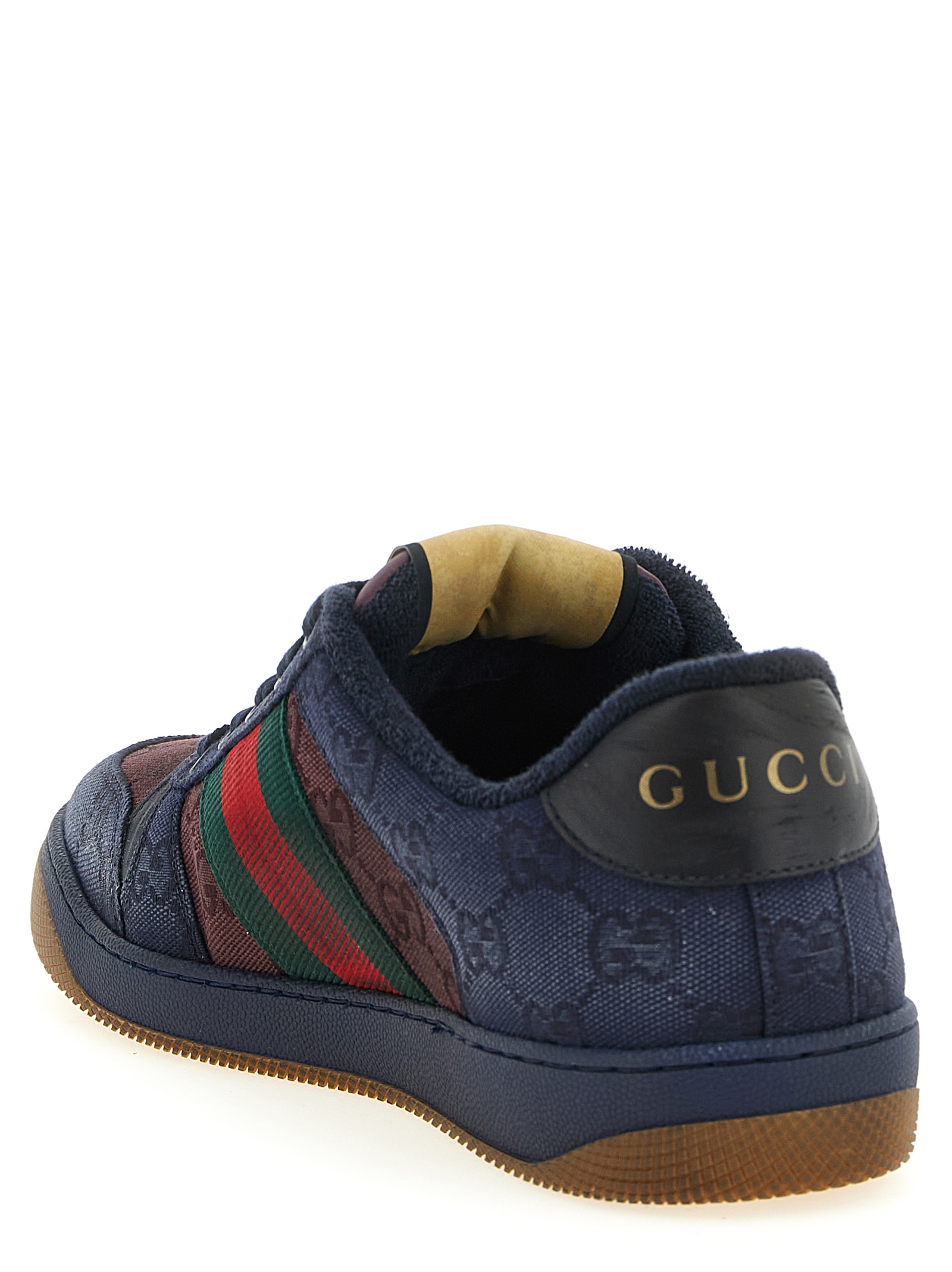‘Screener’ sneakers in two-tone GG fabric with délavé effect and contrasting smooth leather, side Web ribbon, vintage Gucci logo tongue, enamelled oval detail with double G in metal on the front, laces, rubber sole.