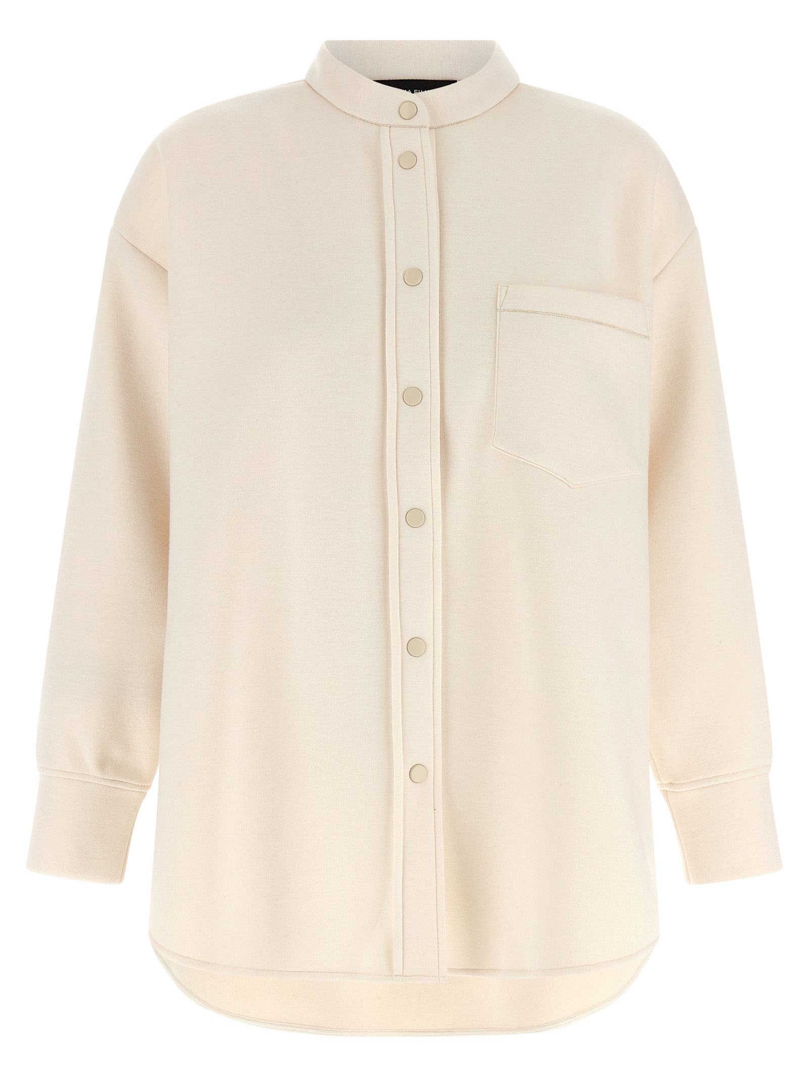 Scuba cashmere shirt with diamond thread details, mandarin collar, chest pocket, front snap button closure, long sleeves with cuffs and dropped shoulder strap, asymmetric hem.