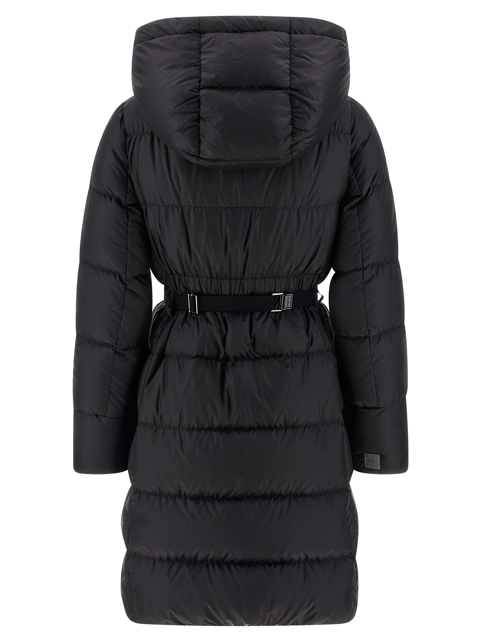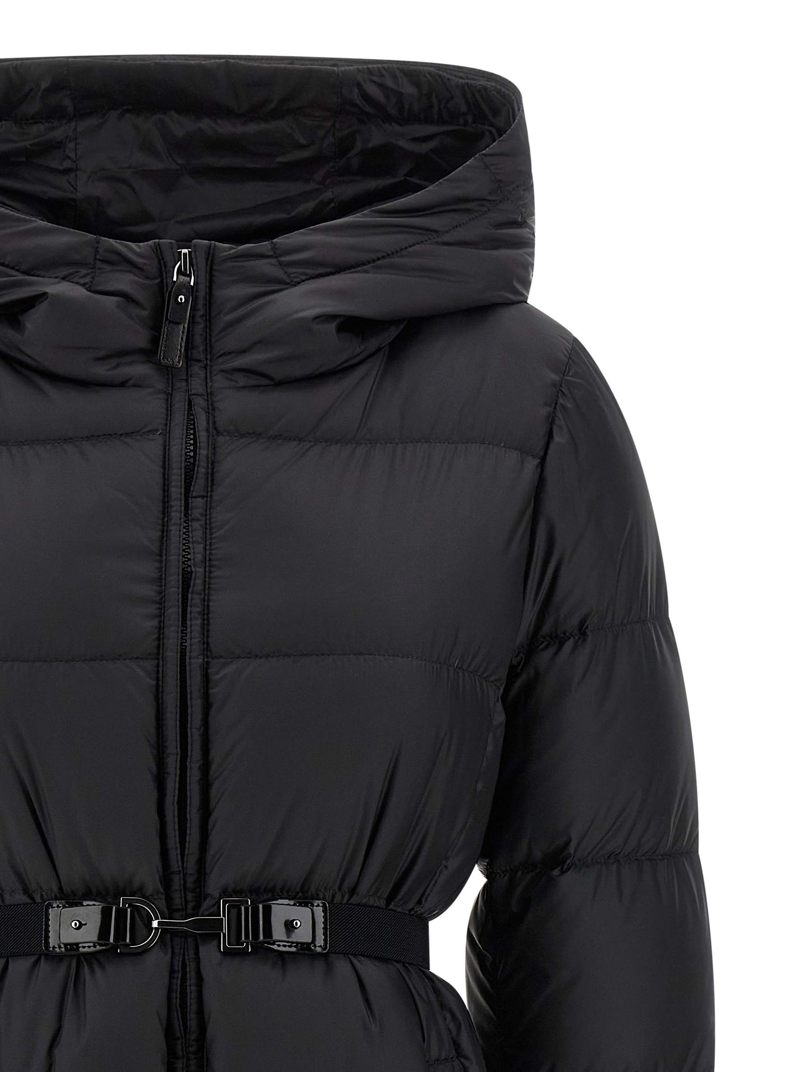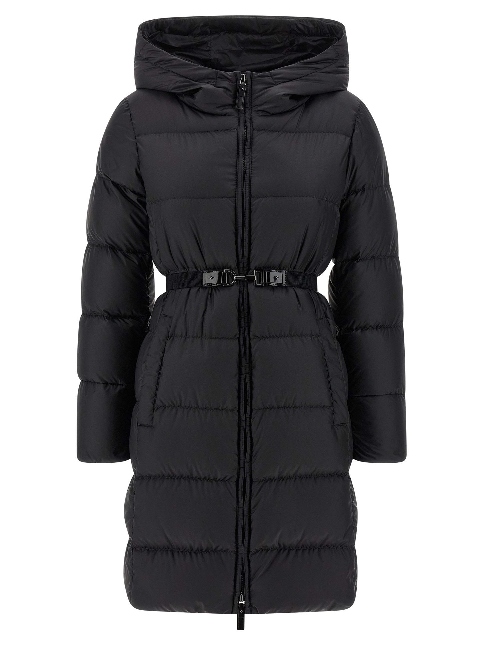 ‘Seipar’ down jacket in waterproof technical canvas quilted with horizontal stripes and goose down padding, hood, front zip closure, pockets, long sleeves, elastic tape belt and removable snap hook buckle.