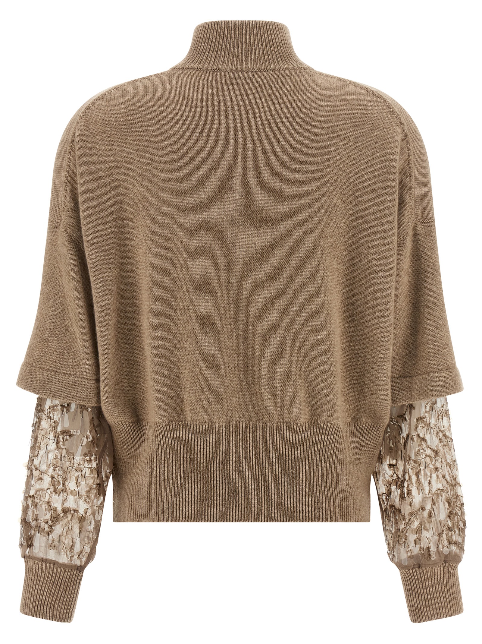 Cashmere cardigan with double layer long sleeves with tulle insert with sequin and cuff appliqué, high neck, front button closure, pockets.