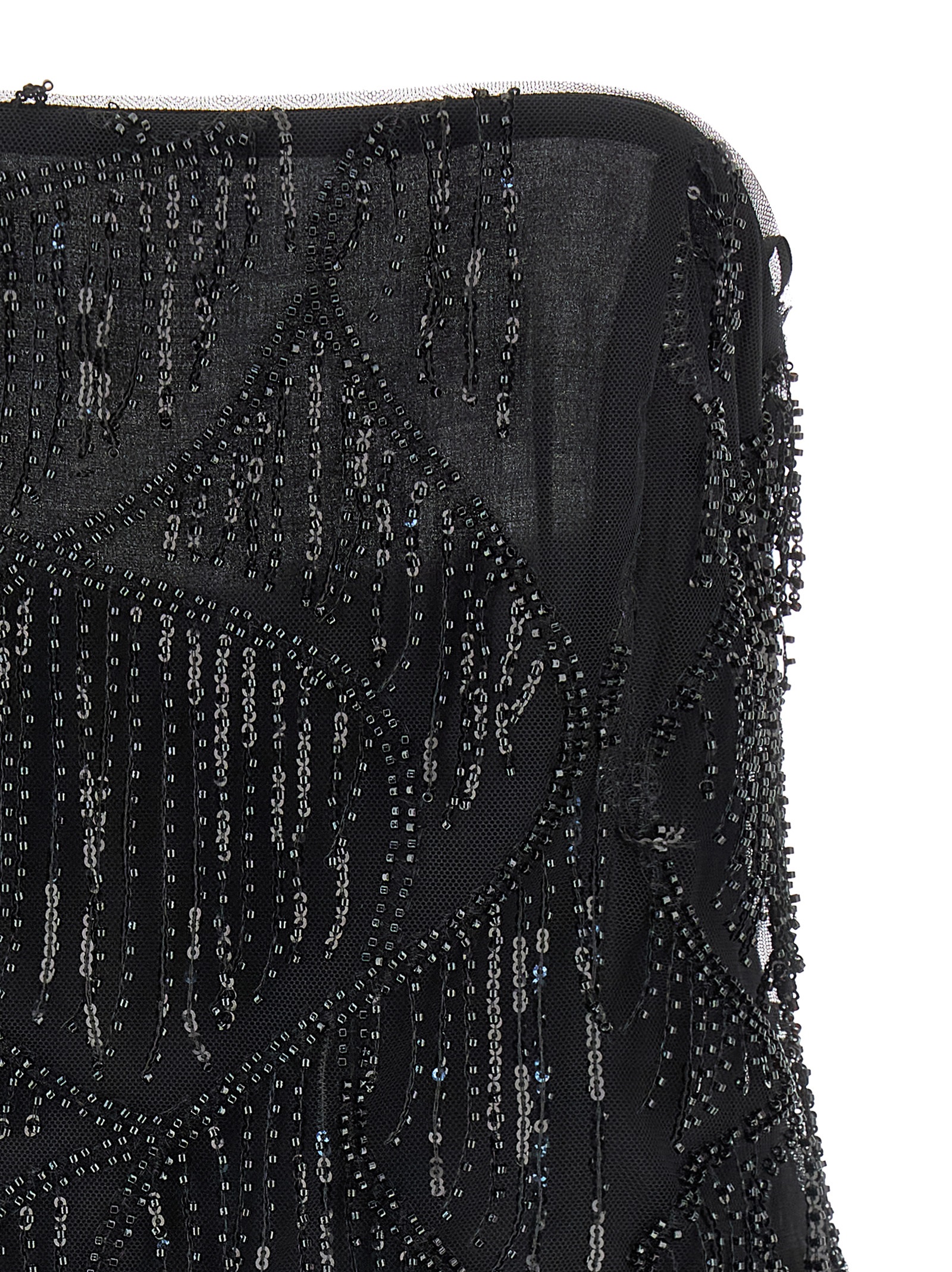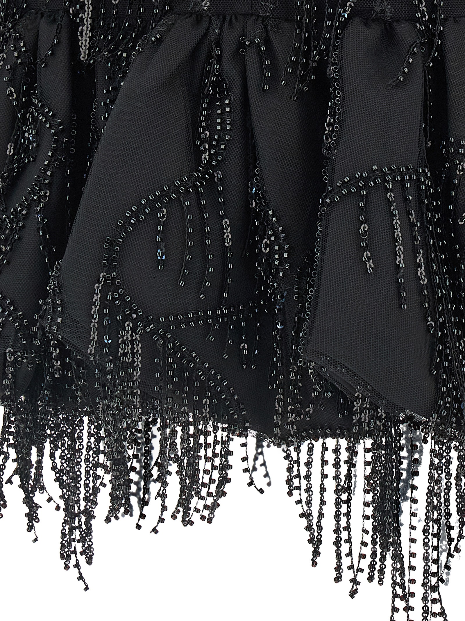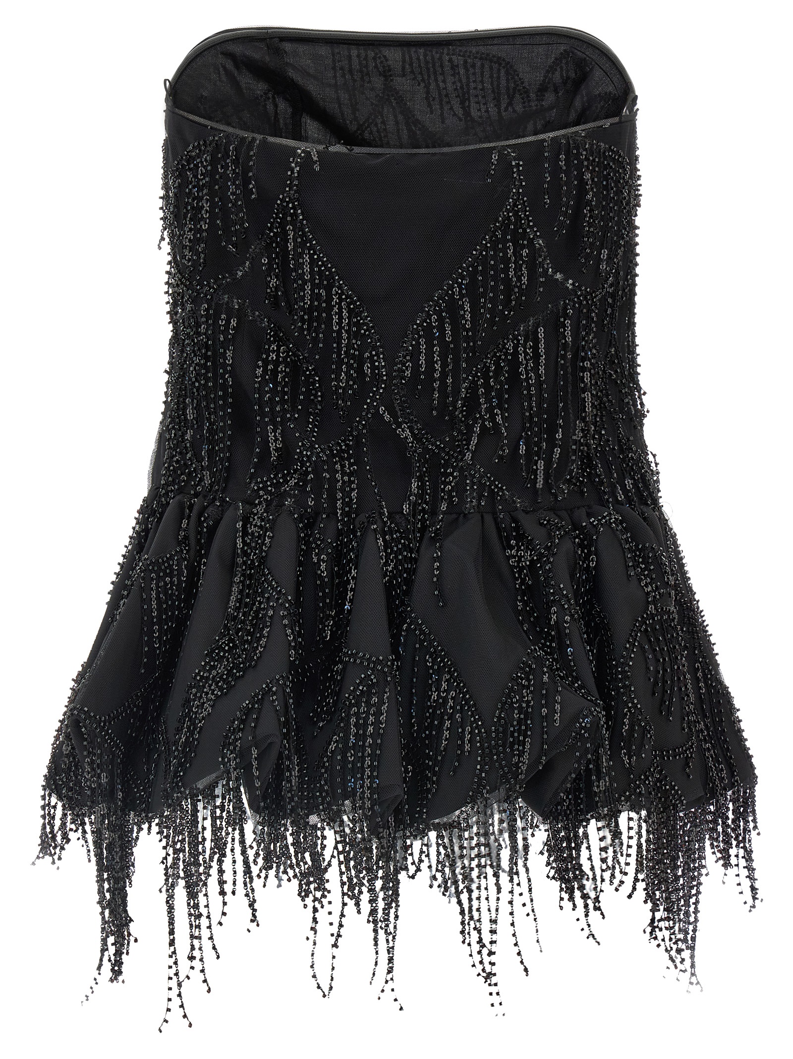 ‘Sequins Bubble’ sleeveless mesh top with fringes of all-over hanging beads, off-the-shoulder model, side zip closure, flared voluminous hem, viscose lining.