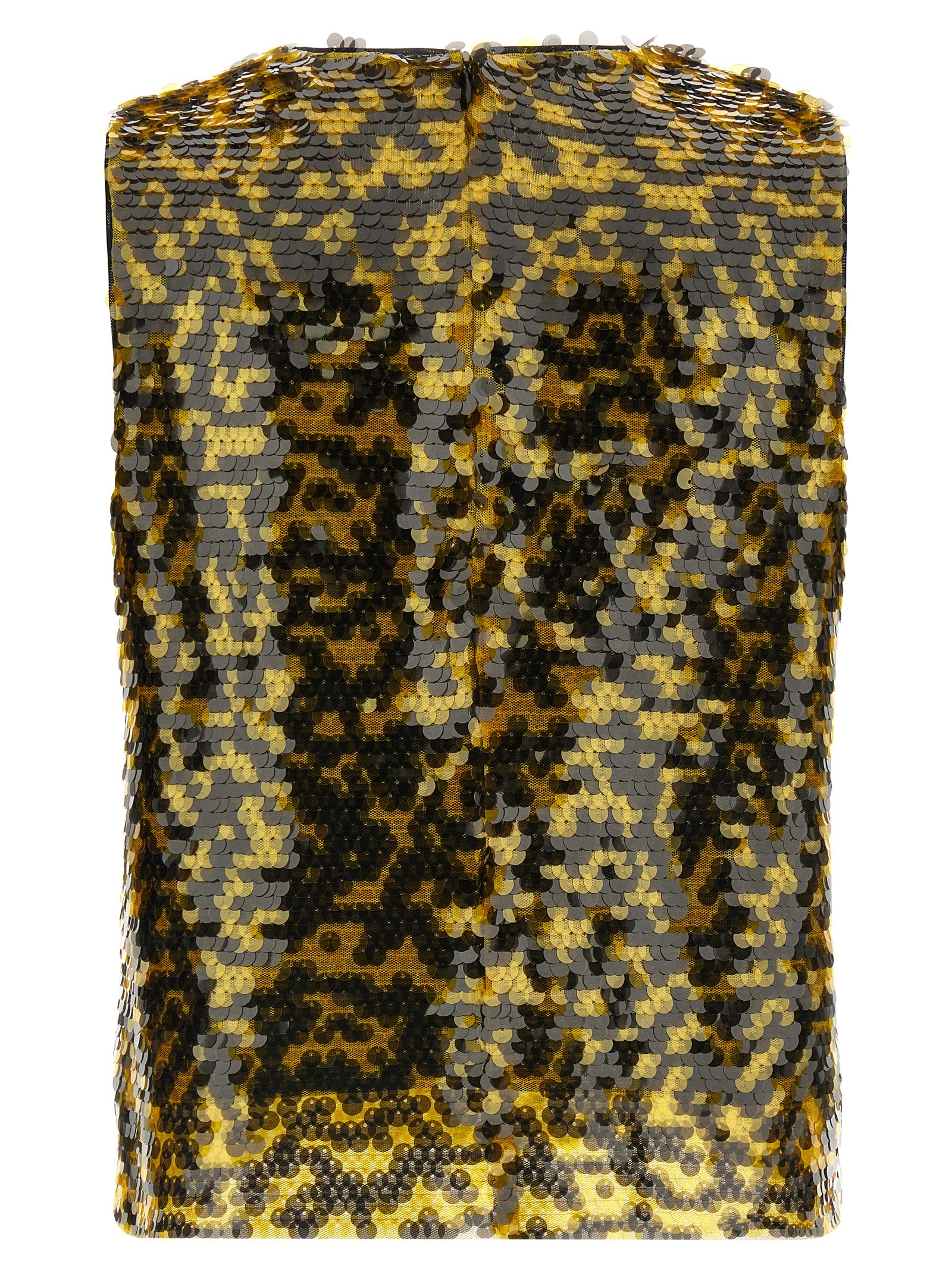 ‘Seraphina’ fabric top covered with two-tone sequins, slightly cropped pattern, square silhouette, crew neck, back zip closure.