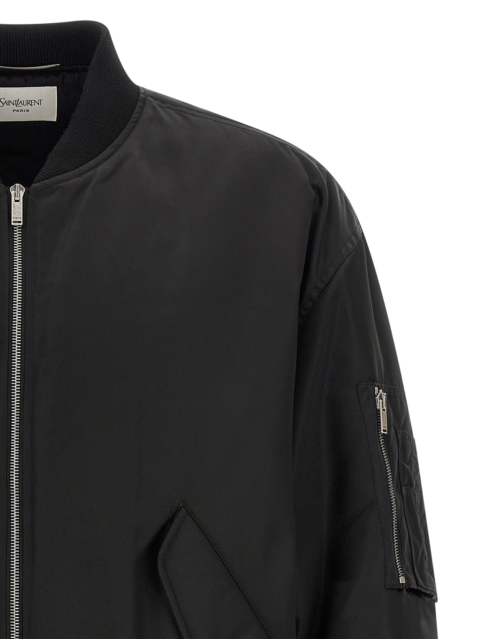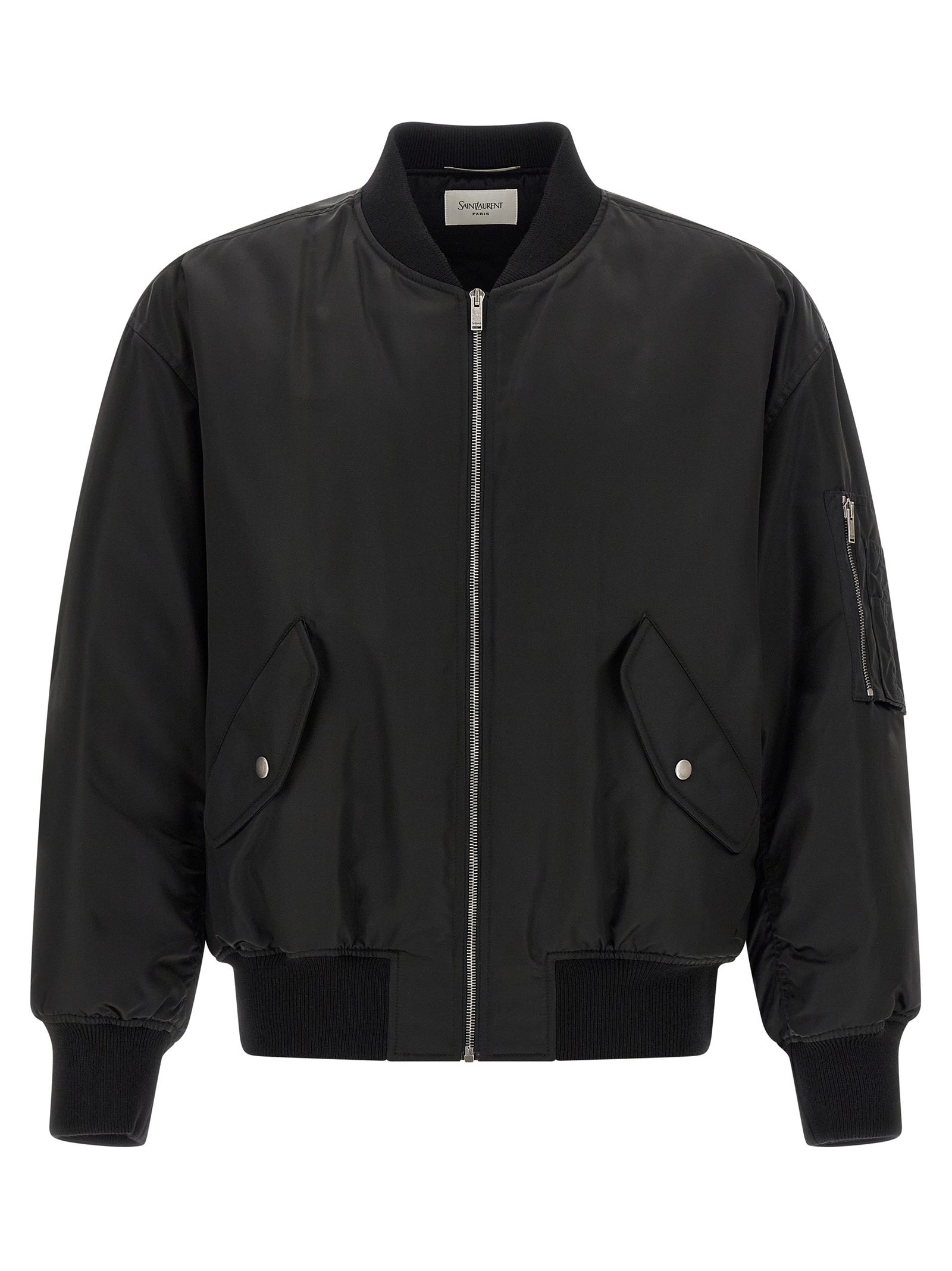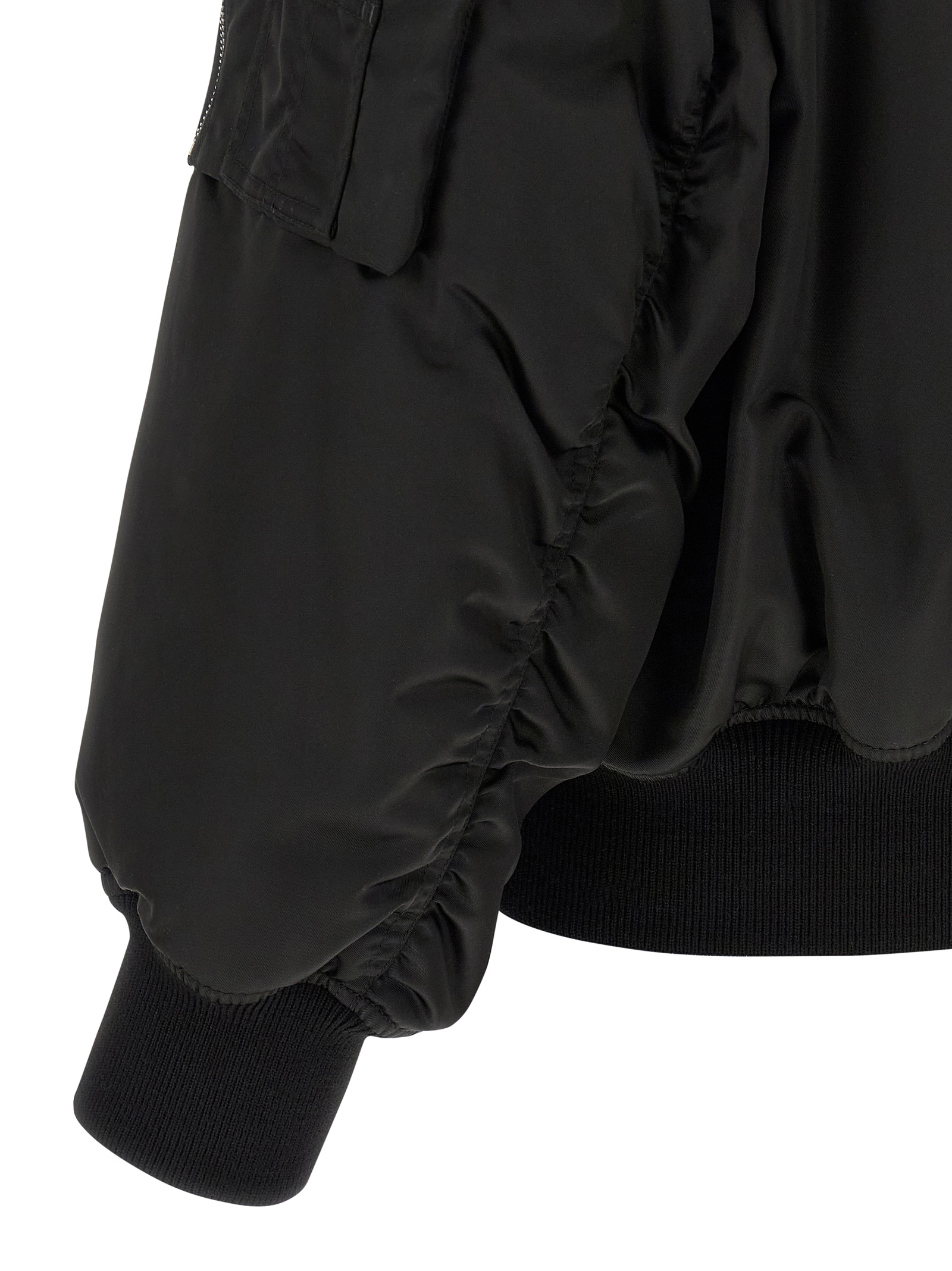 Water-repellent nylon serge bomber jacket with ribbed stretch knit details, front zip closure, pockets, long sleeves with cuffs and dropped shoulder, viscose and cotton blend lining.