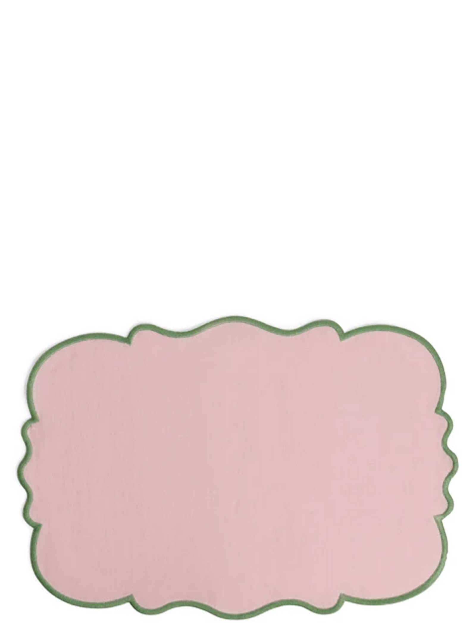 Set of 2 linen placemats with contrasting scalloped edge and stain-resistant treatment.