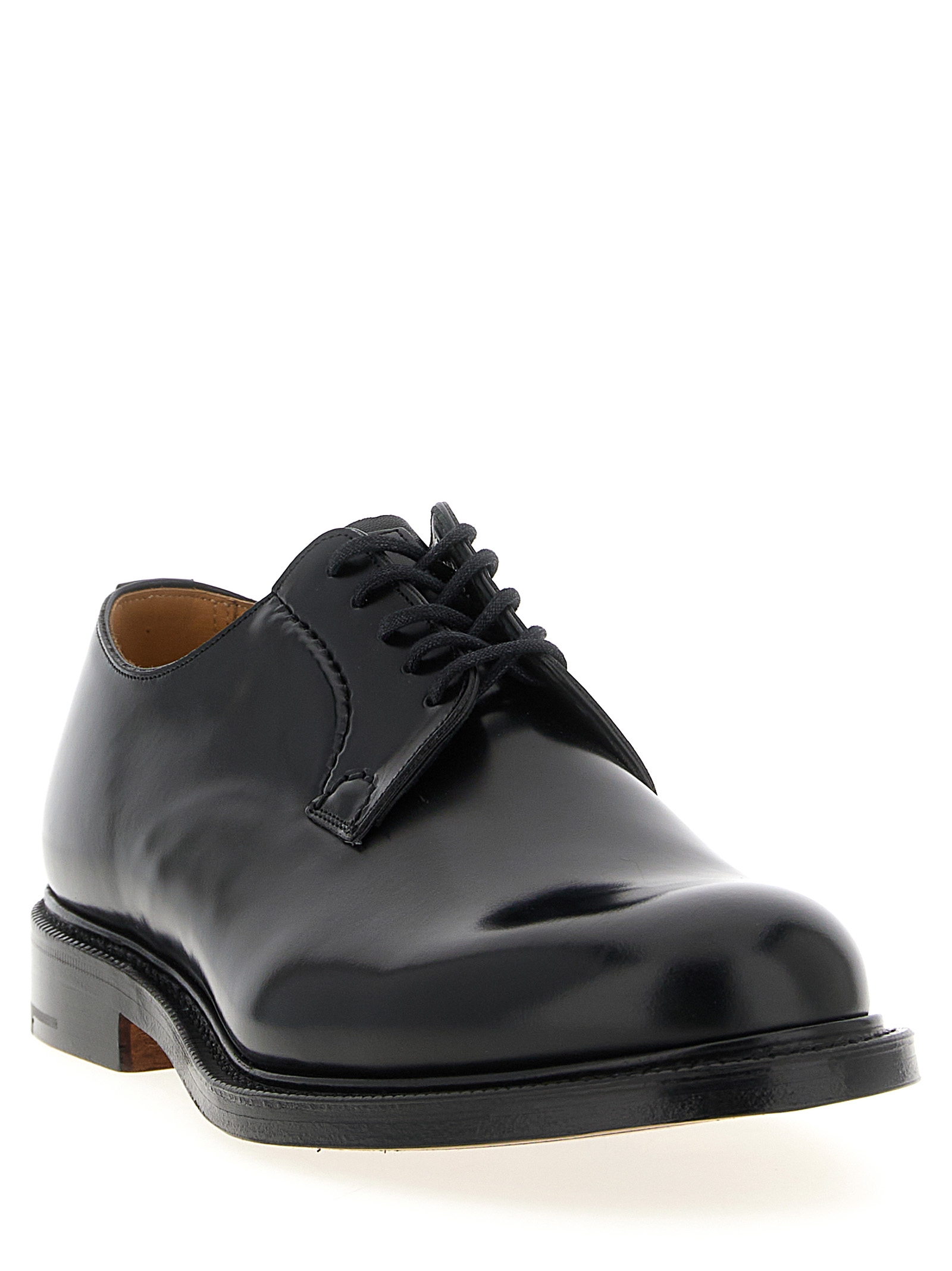 ‘Shannon’ derby in polished brushed calf leather, rounded toe, lace-up closure, triple leather sole with rain welt.