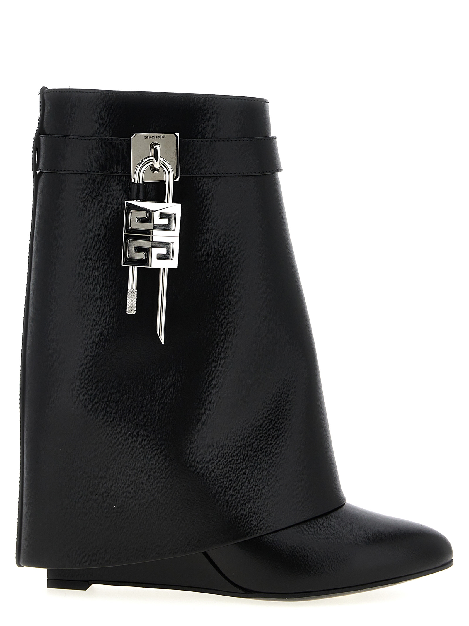‘Shark Lock’ leather tube ankle boots with rounded toe, side zip closure, leather band with GIVENCHY metal closure, silver finish 4G Lock on the right side and GIVENCHY gold and silver lock on the left side, covered wedge heel, leather sole.
