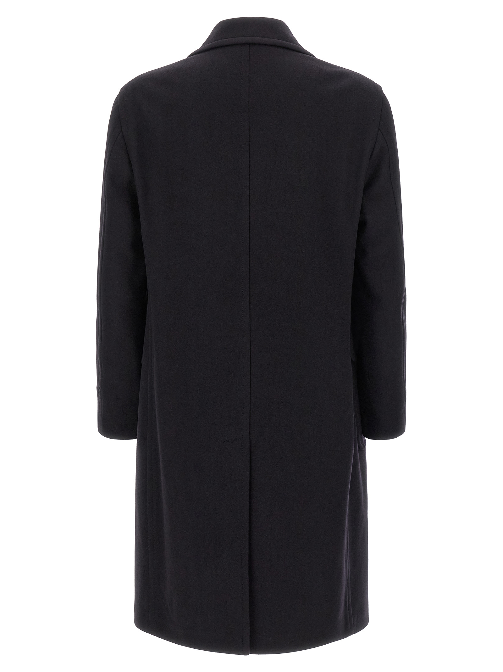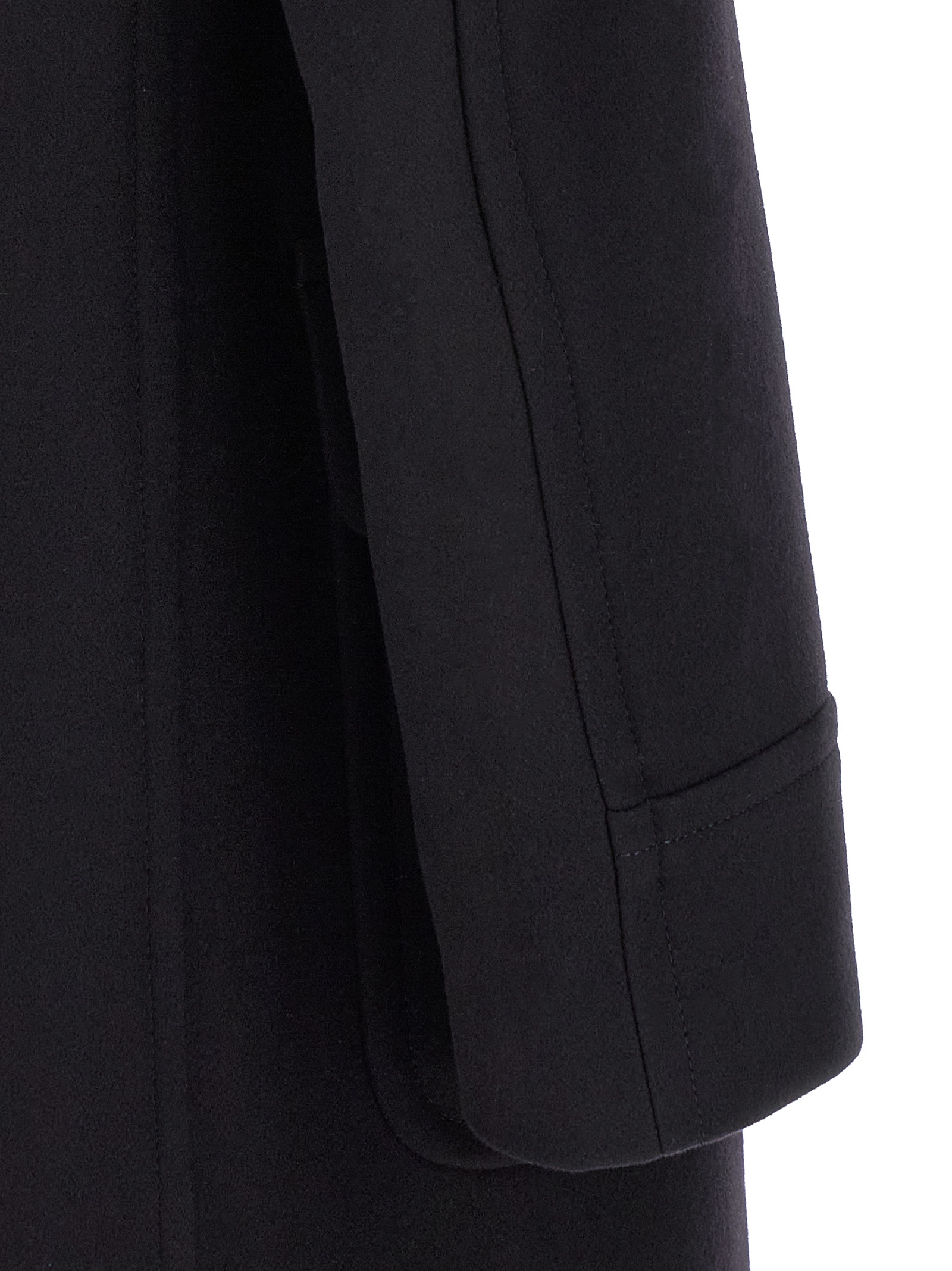 Double-breasted ‘Sherry’ wool and cashmere blend midi coat with front horn button closure, collar with back leather insert, mirror lapels with removable metal brooch, pockets, long sleeves, structured shoulder, back split, half cupro monogram lining, two inner pockets.