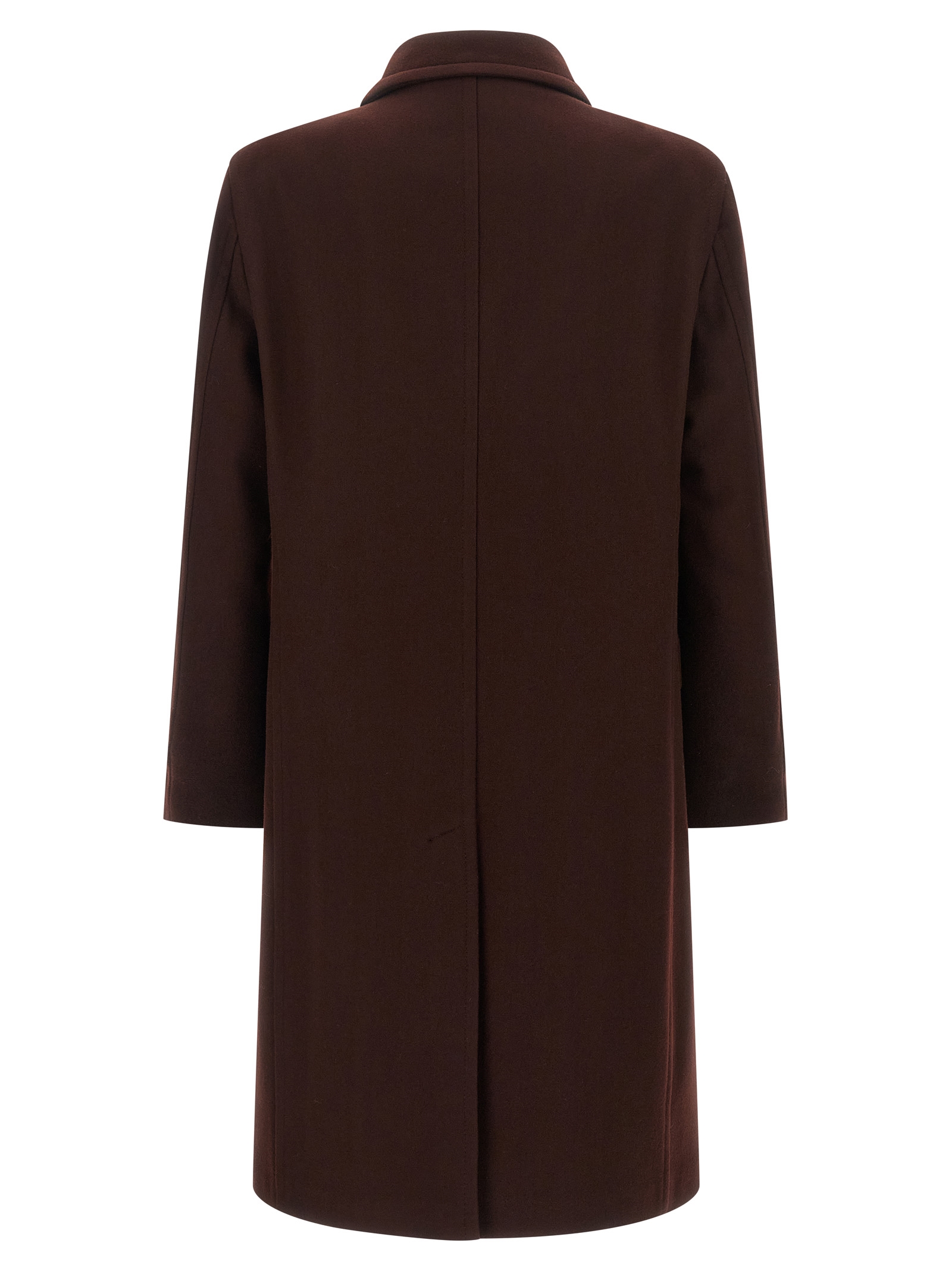 Double-breasted ‘Sherry’ wool and cashmere blend midi coat with front horn button closure, collar with back leather insert, mirror lapels with removable metal brooch, pockets, long sleeves, structured shoulder, back split, half cupro monogram lining, two inner pockets.