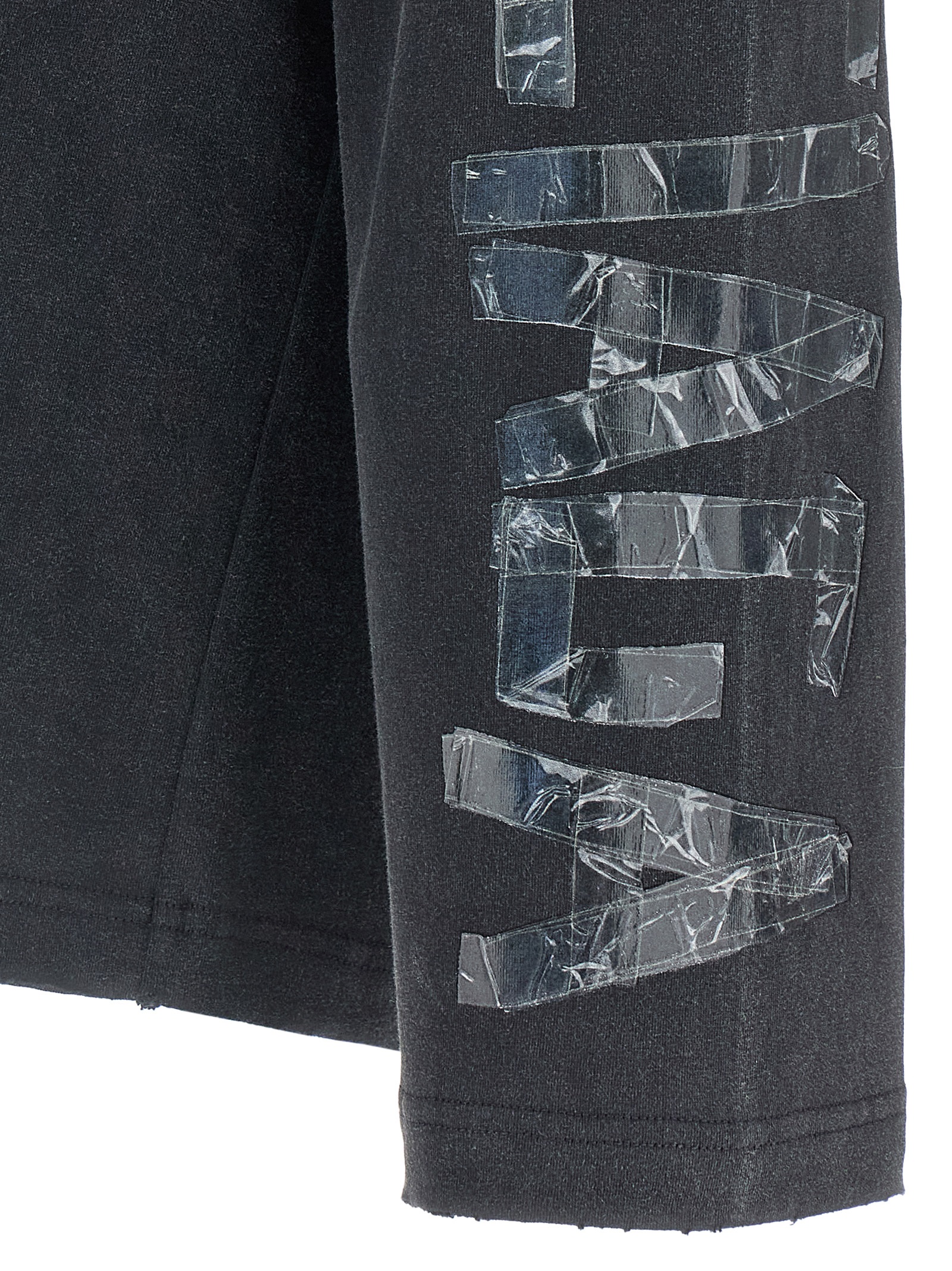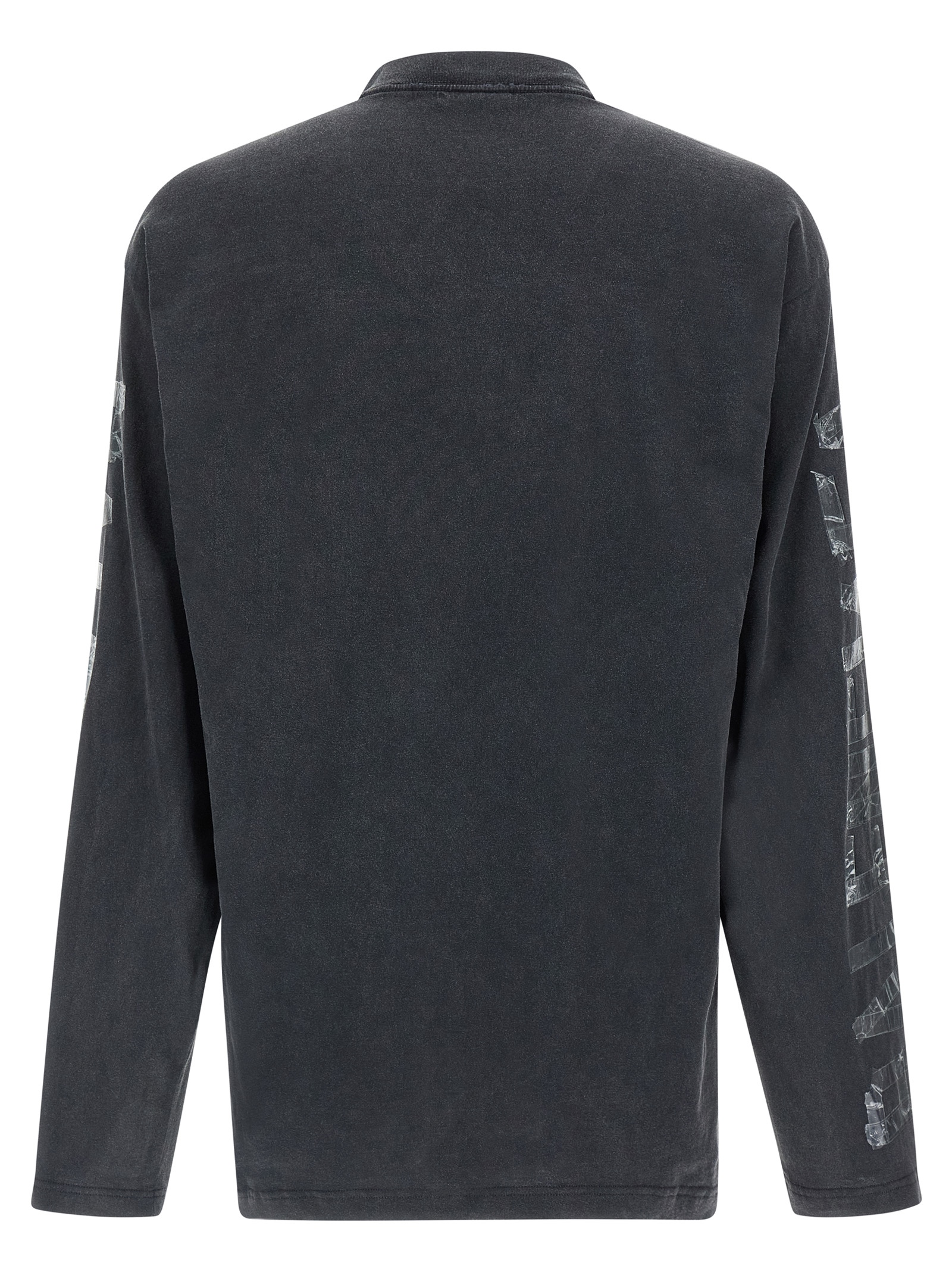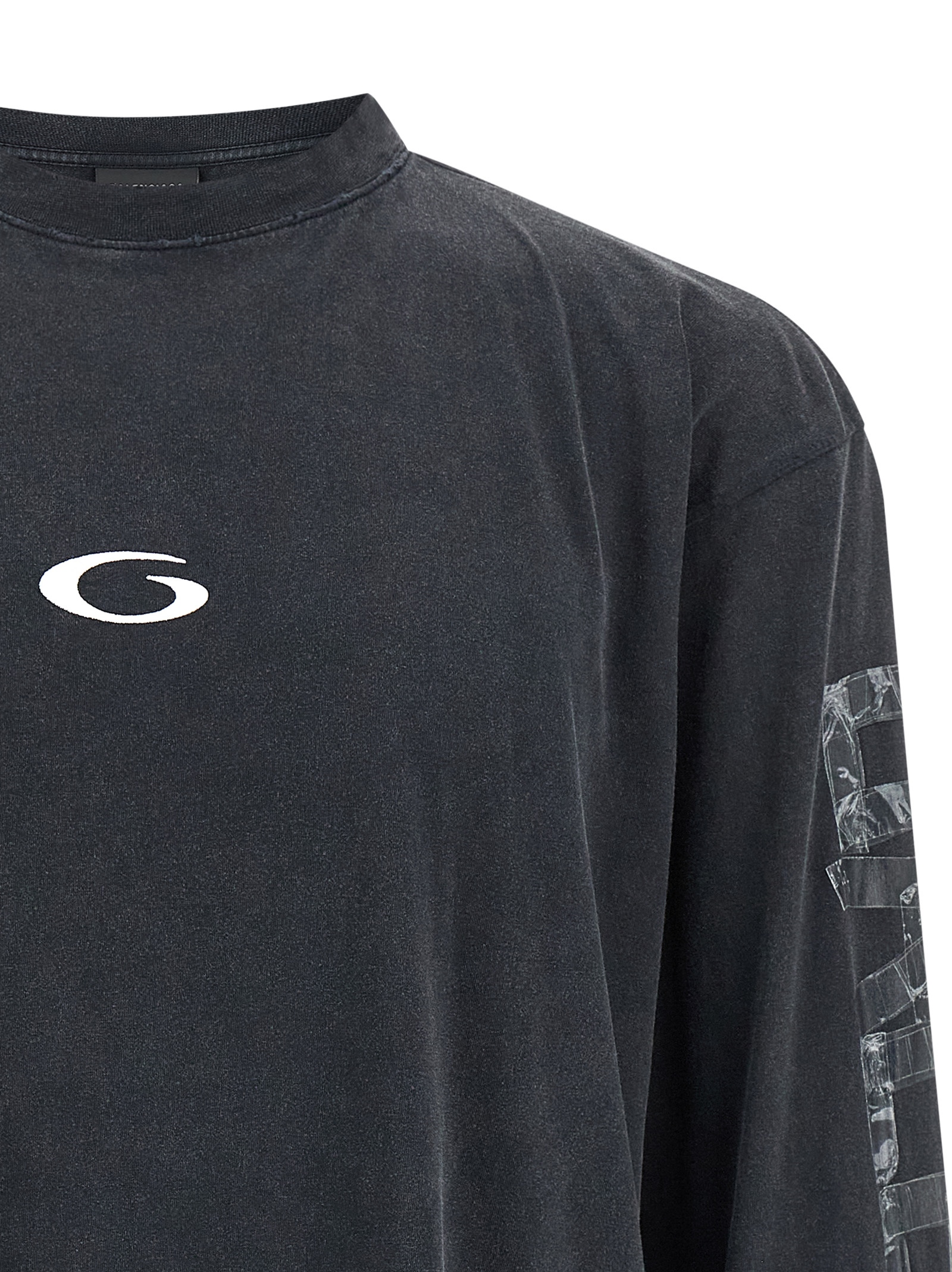 ‘Shifted’ faded dry jersey T-shirt, front ‘Loop Sports’ embroidery, crew neck, long cuffed sleeves, ‘Transparent Tape’ print and dropped shoulders, asymmetrical hem.