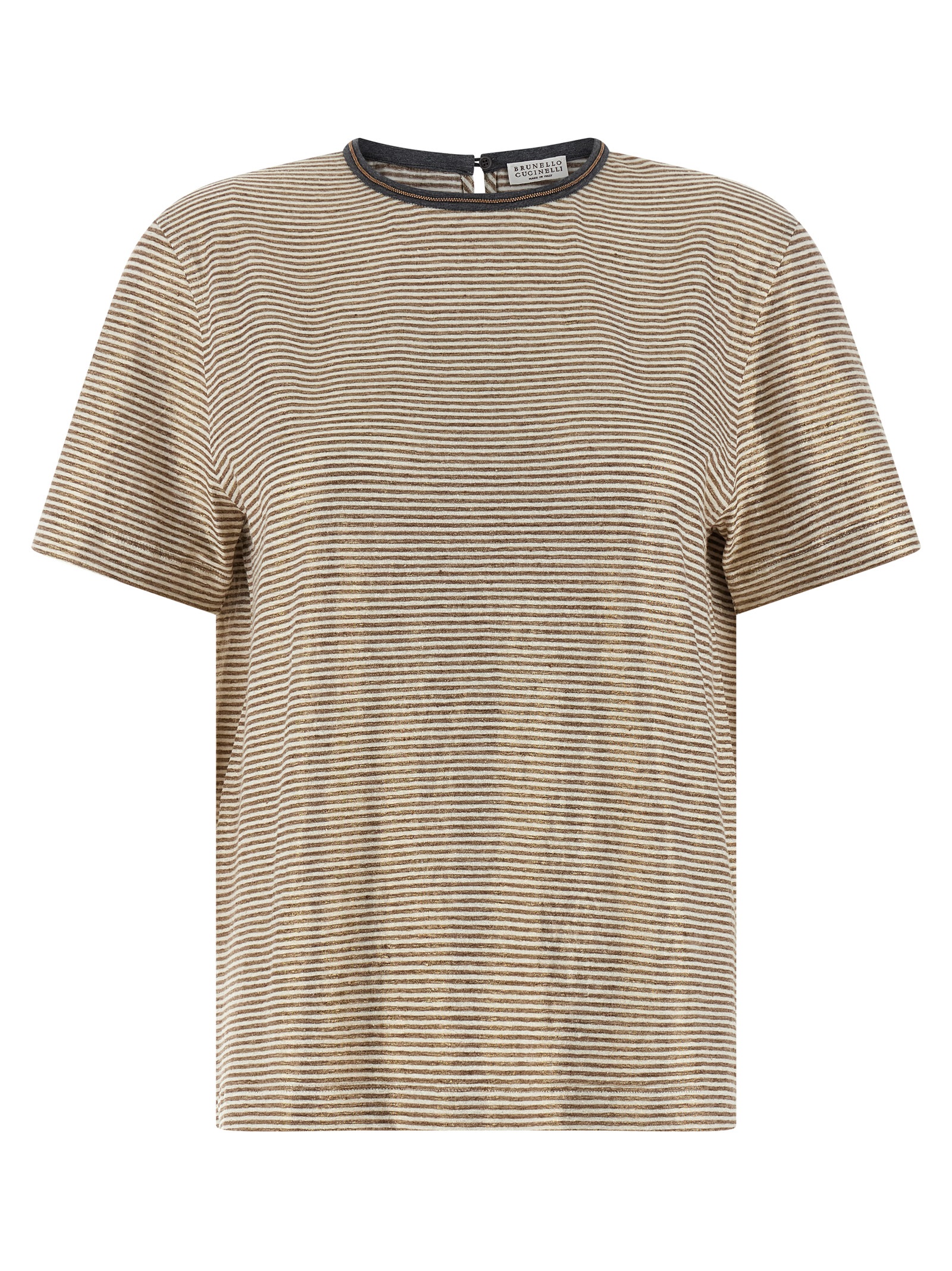 Striped stretch linen T-shirt with crewneck and contrast piping, ‘Shiny Collar Detail’ in Monile and back button closure with cut-out teardrop detail, and short sleeves.