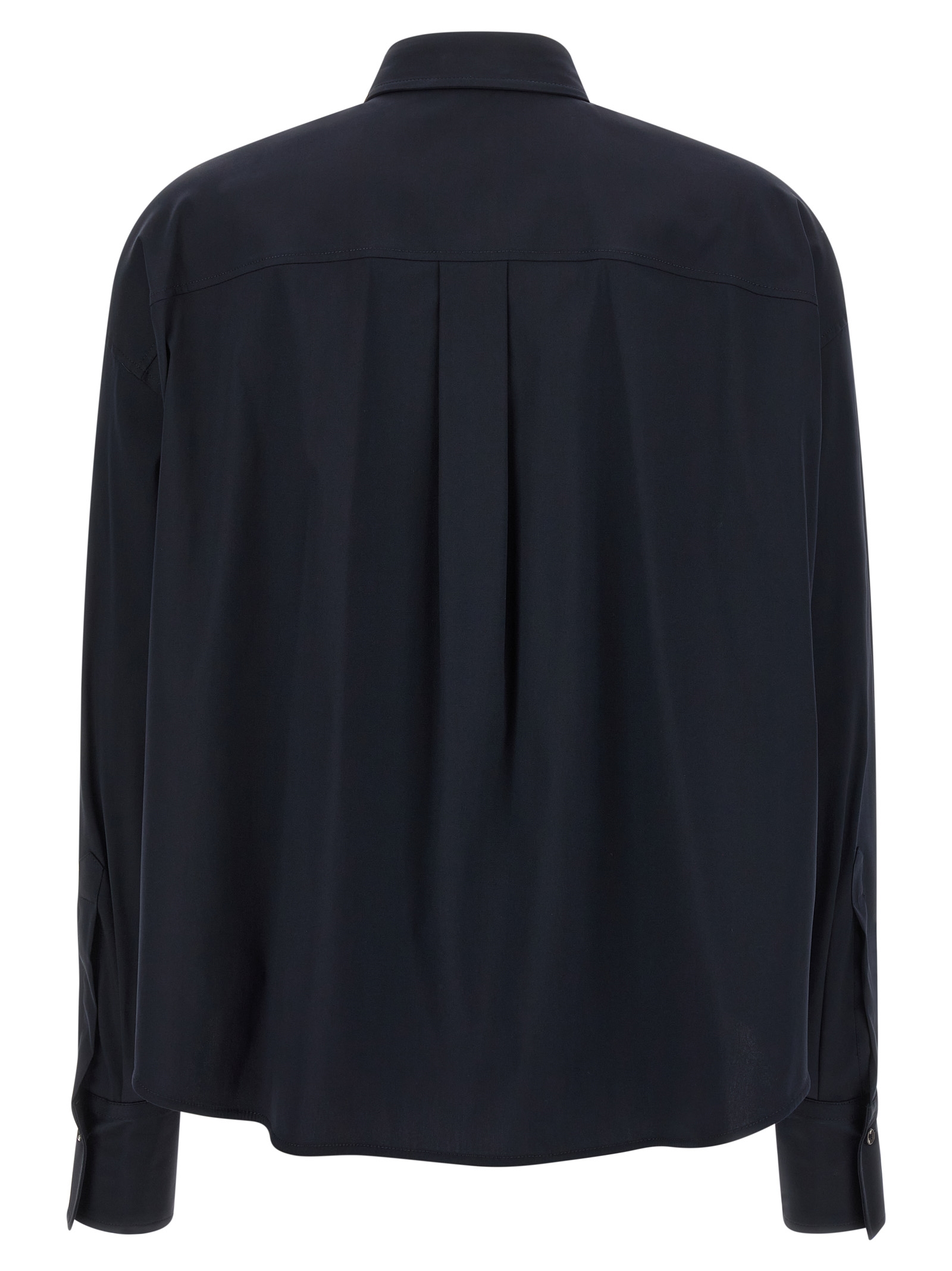 Stretch cotton poplin shirt, breast pocket with Monile ‘Shiny Flap Detail’, front button closure, slightly wide long sleeves with cuffs and dropped shoulders.
