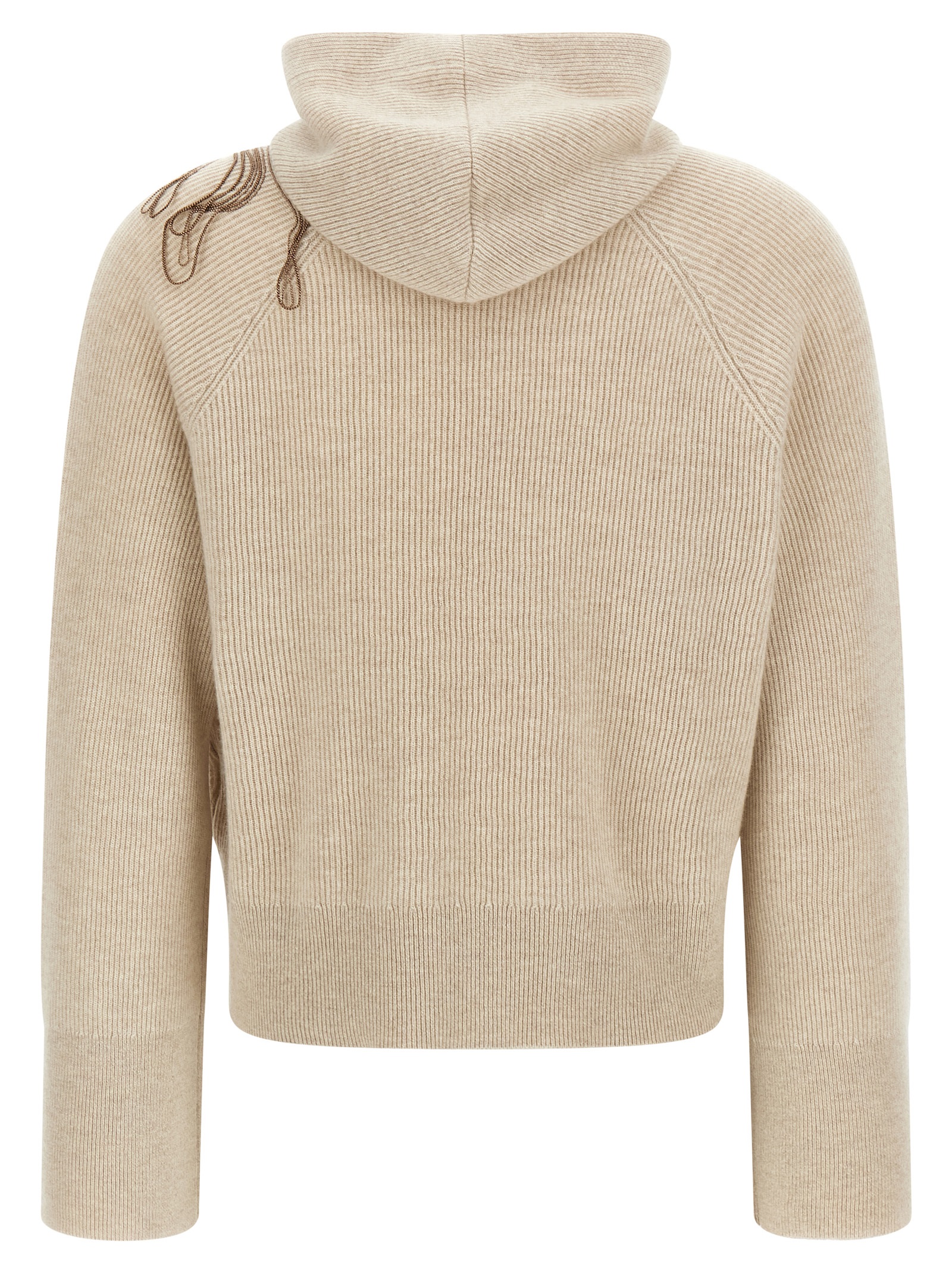 English ribbed cashmere hooded sweater with ‘Shiny Flower Embroidery’ embroidery with thin jewel threads on the front, long sleeves with dropped shoulders.