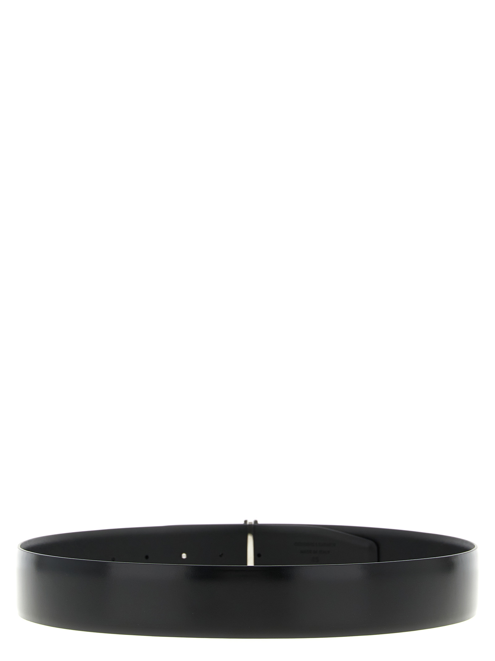 Shiny smooth calf leather reversible belt with enamel metal logo buckle.