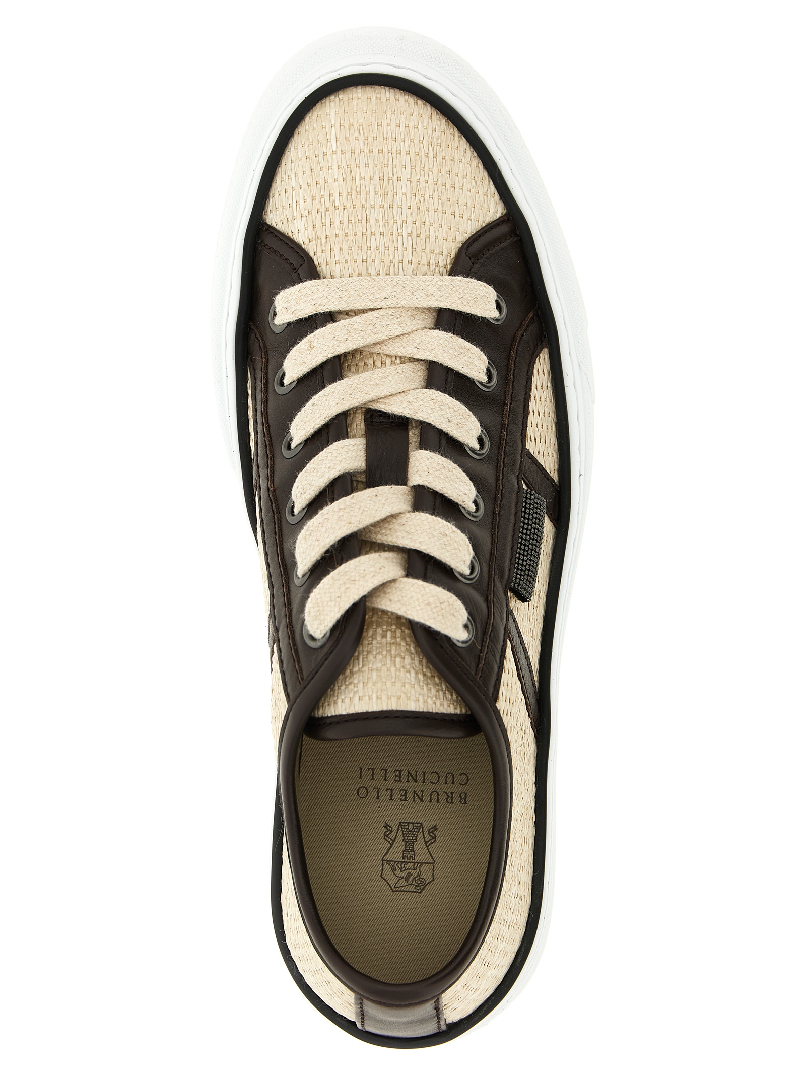 Braided techno raffia sneakers with contrasting smooth leather details, water-repellent cotton blend fabric lining, side Monile ‘Shiny Tab’ detail, lace-up closure, rubber sole.