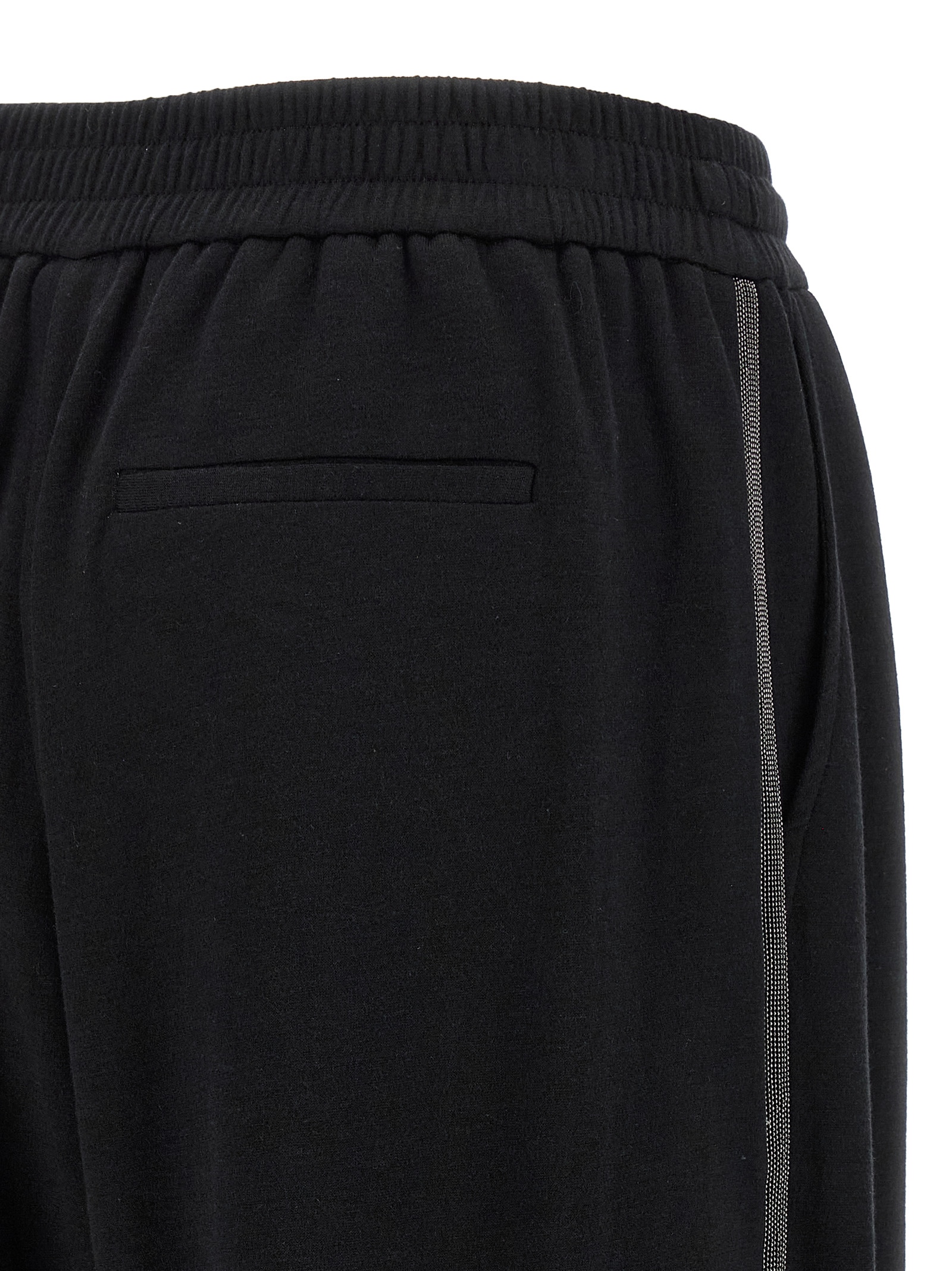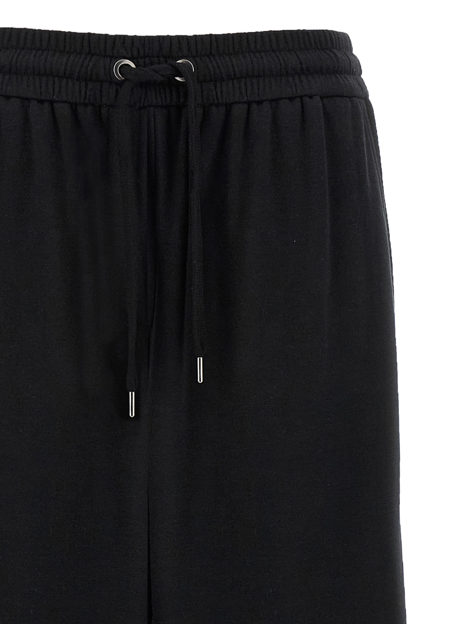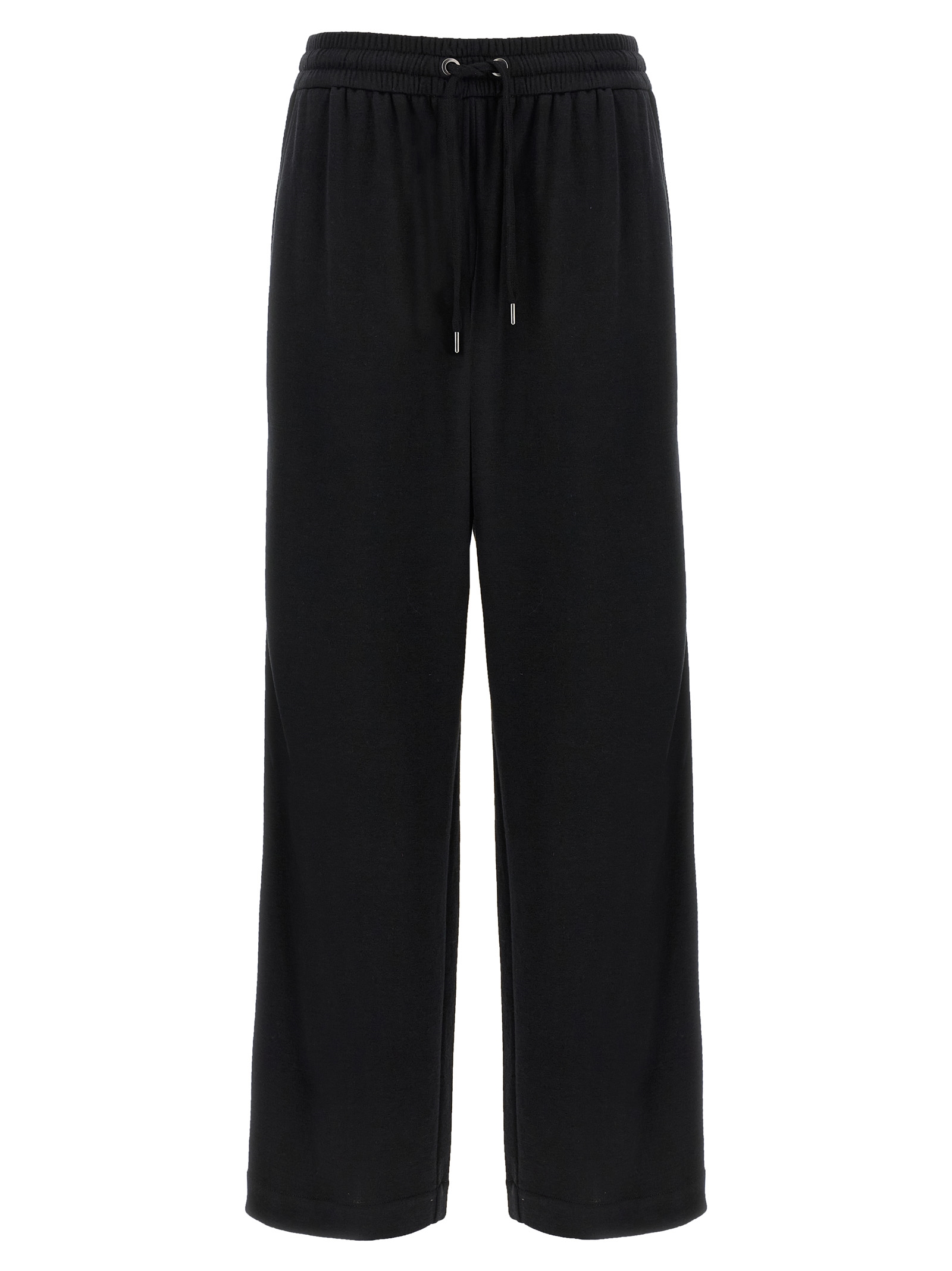 Cotton and silk interlock joggers, side ‘Shiny Trims’ detail, wide leg, adjustable drawstring elastic at the waist, pockets.