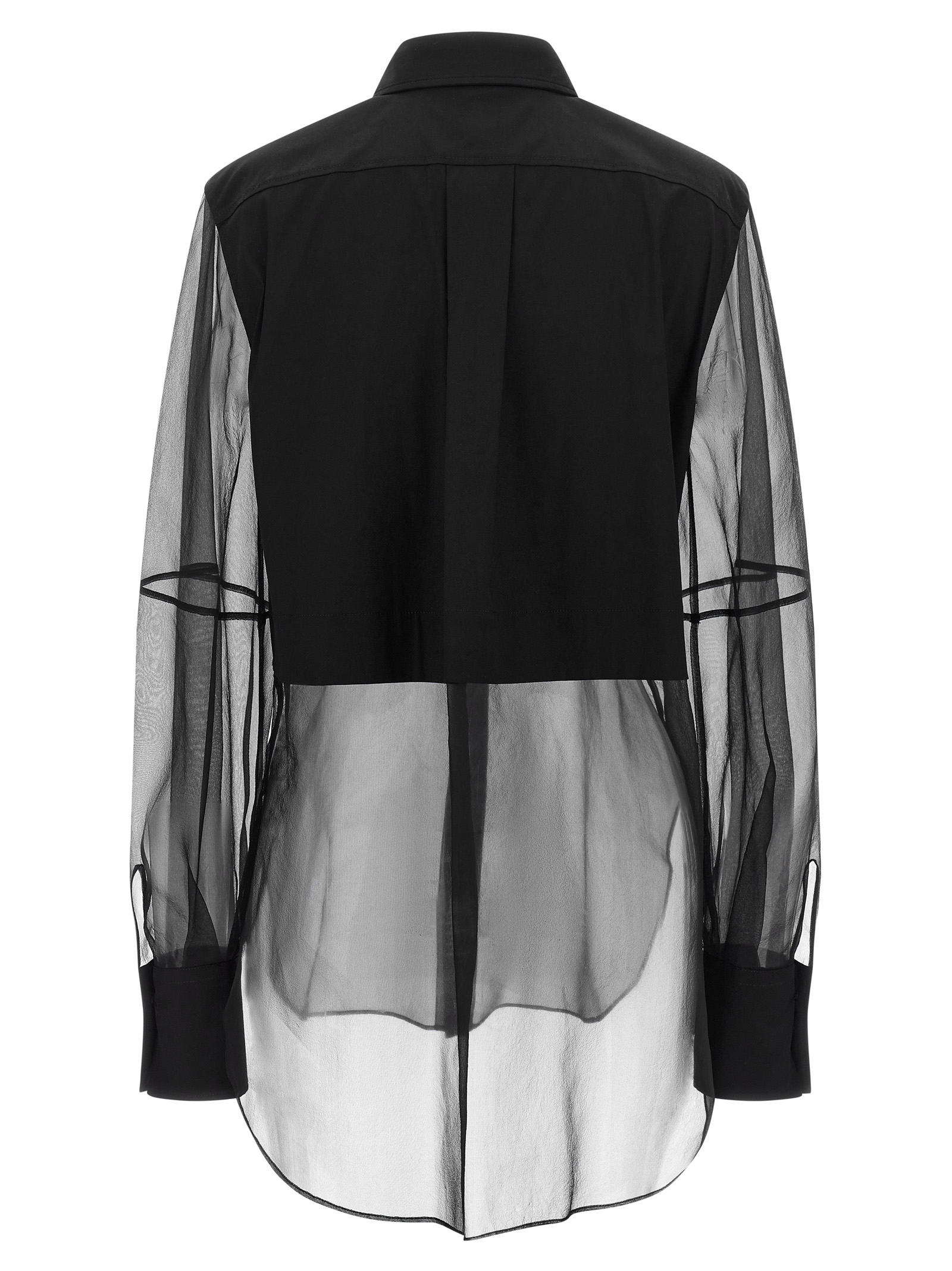Stretch cotton poplin and semi-transparent crispy silk shirt, concealed front button closure with Monile ‘Shiny Trims’ detail, long wide sleeves with cuffs.