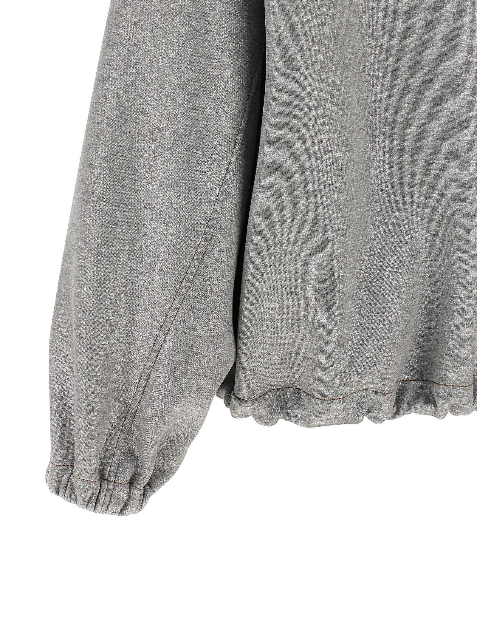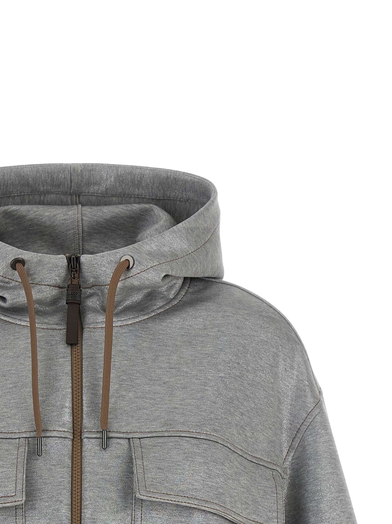Bomber jacket in mélange cotton woven with metallic yarn, contrast stitching, adjustable hood, high neck, zip closure with zipper puller ‘Shiny Zipper Pull’ in jewel on the front, pockets, long sleeves with elastic cuffs and dropped shoulder, elastic with drawstring on the hem, unlined.