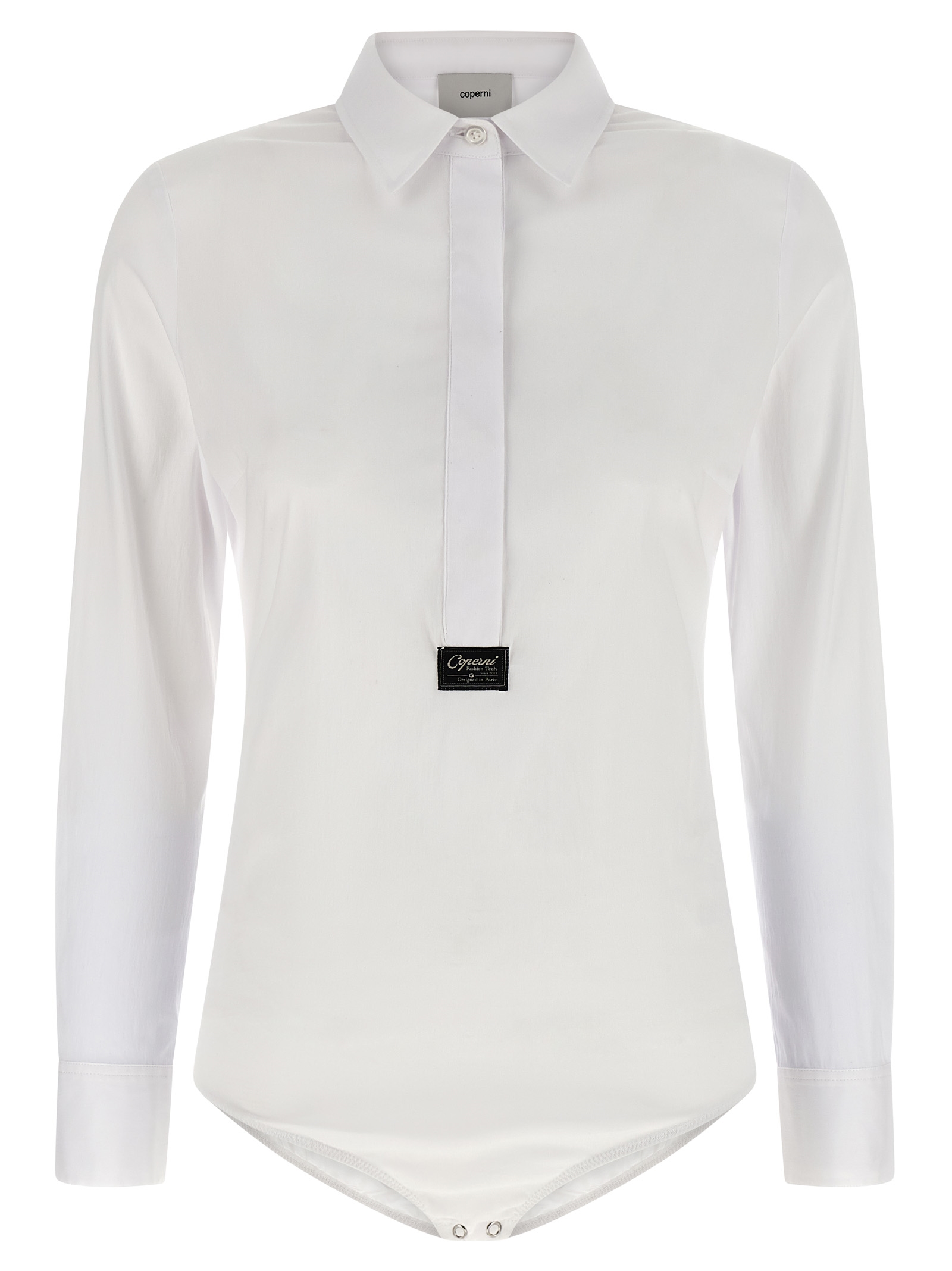 Shirt-style bodysuit in stretch cotton blend, logo patch and concealed front button closure, long cuffed sleeves, elastic hem with snap button closure.