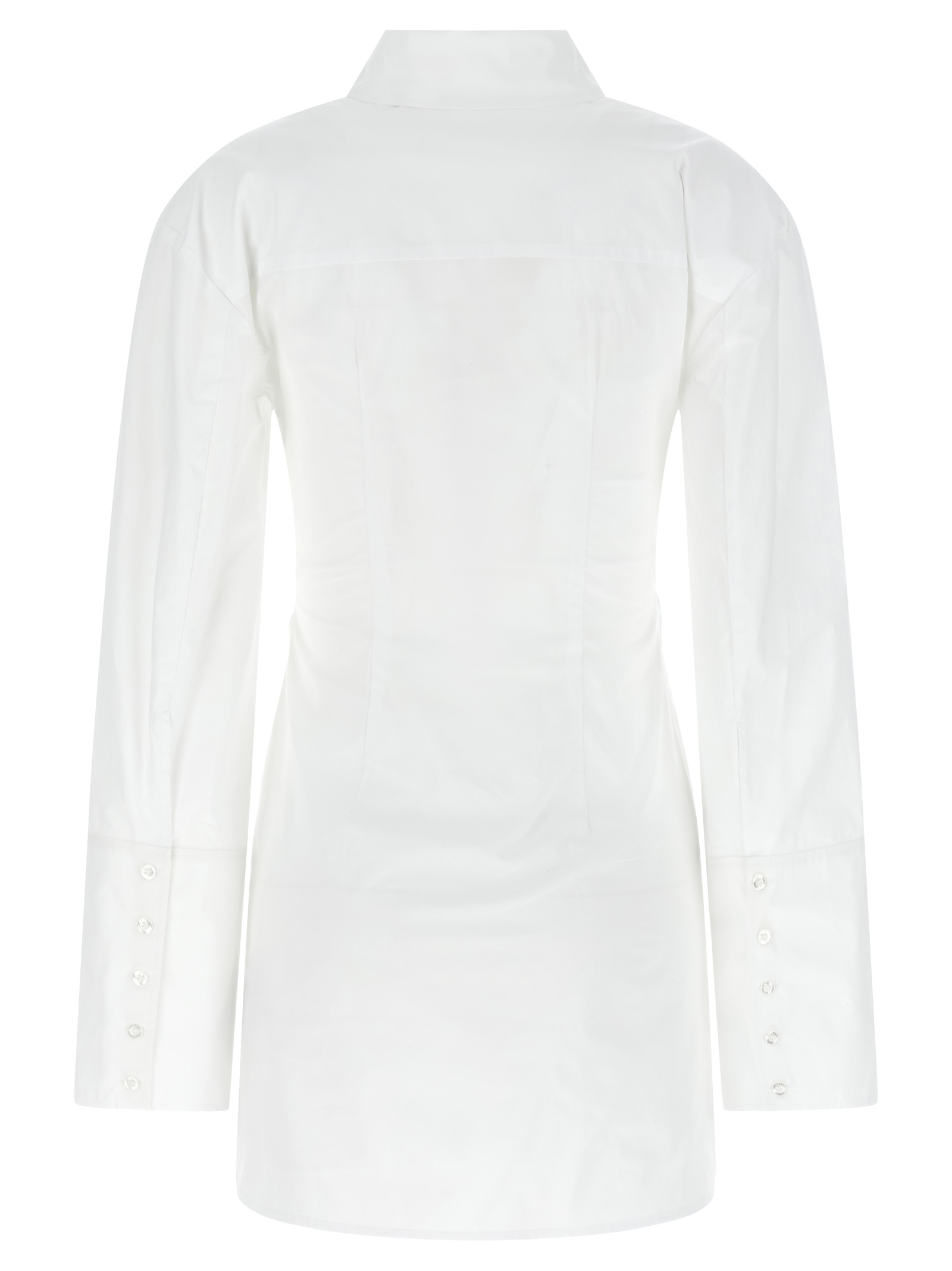 Mini dress in cotton poplin with shirt style, collar, front button closure, front curl, detachable petticoat with shoulder straps, long sleeves with cuffs.