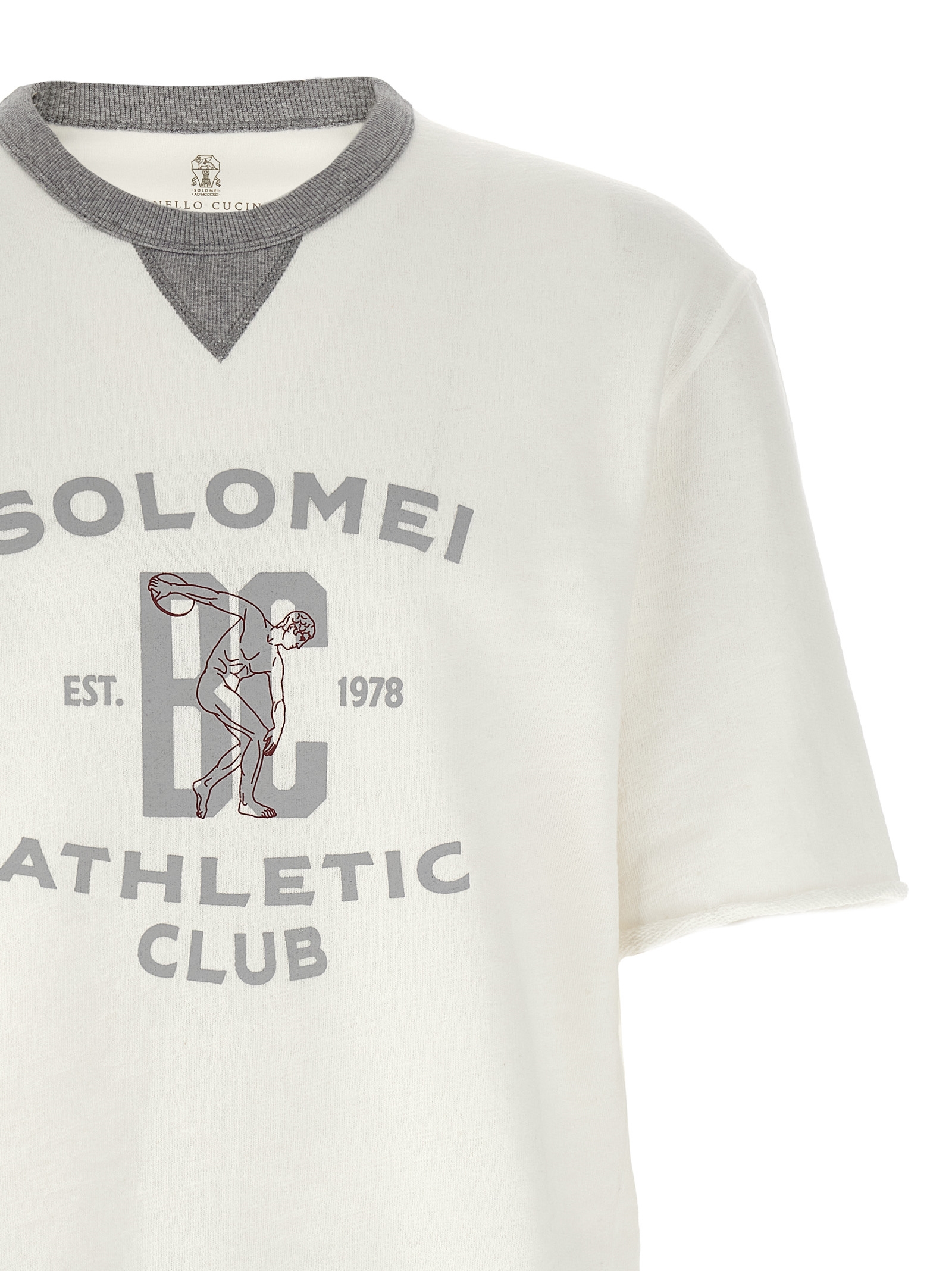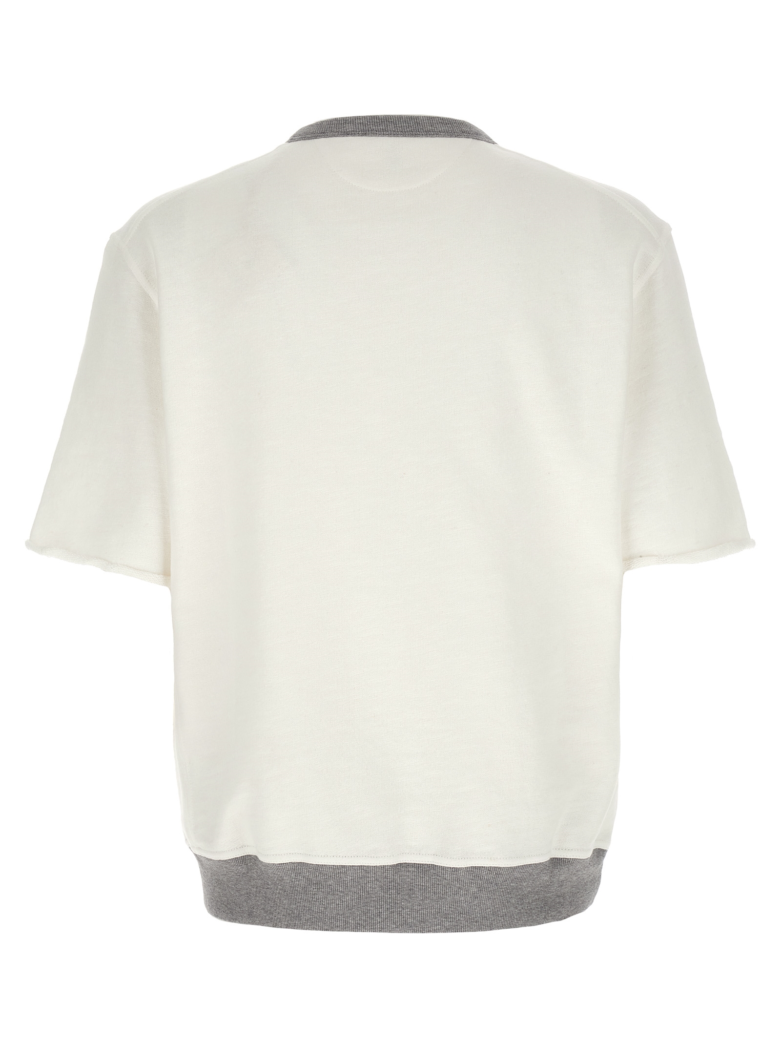 Cotton and linen mélange sweatshirt with contrast ribbed stretch knit details, front print, crew neck, short sleeves with raw cut hem, and headband.