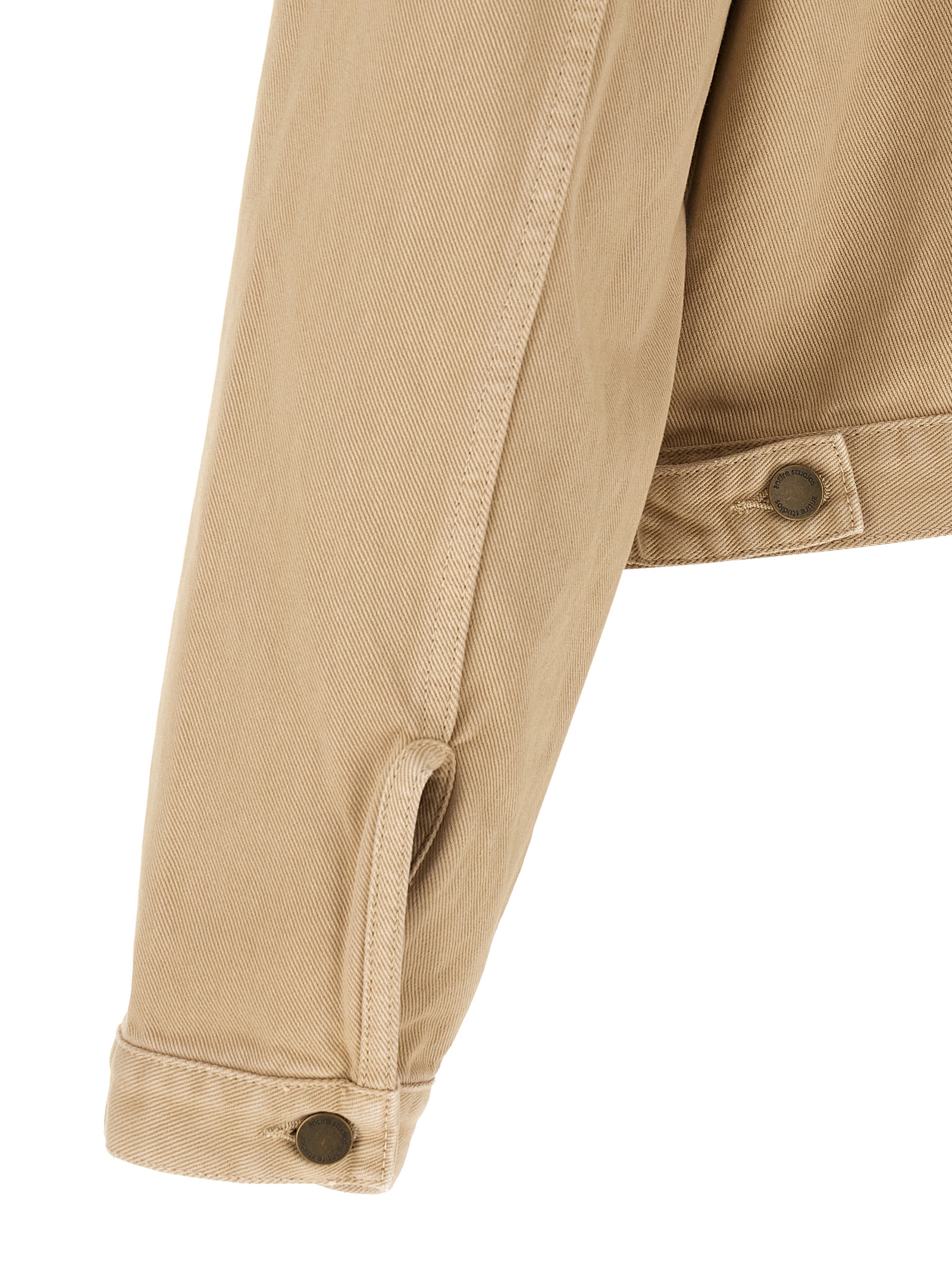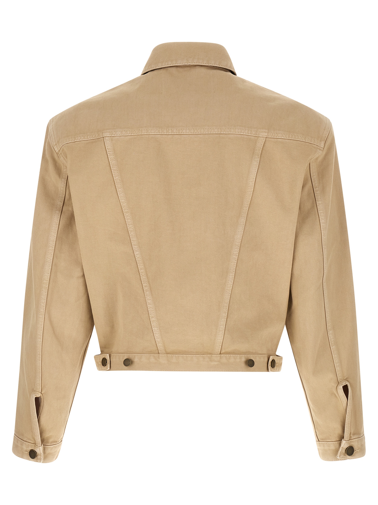 Shrunken Denim jacket in Japanese cotton denim with inverted triangle silhouette, shirt collar, front button closure, pockets, padded shoulder, long sleeves with cuffs, adjustable straps on the hem.