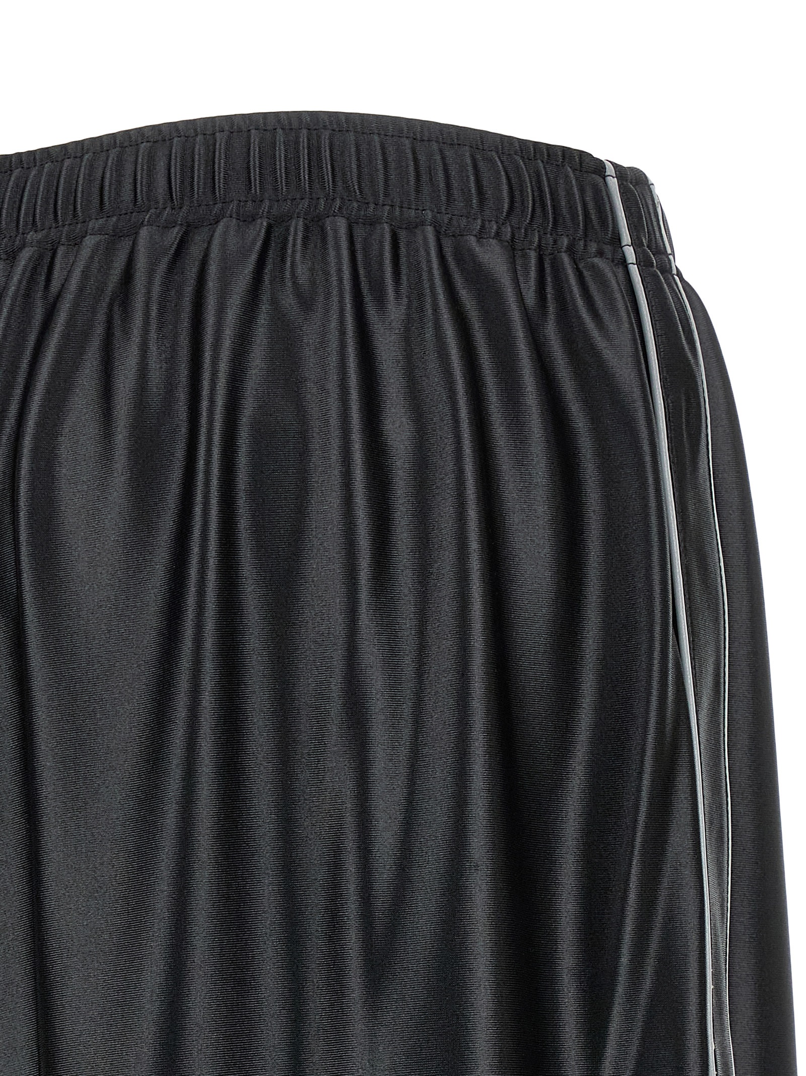 Satin-effect fabric joggers, front embossed logo, reflective asymmetrical side bands, mid waist, extra wide leg, drawstring elastic waistband, pockets