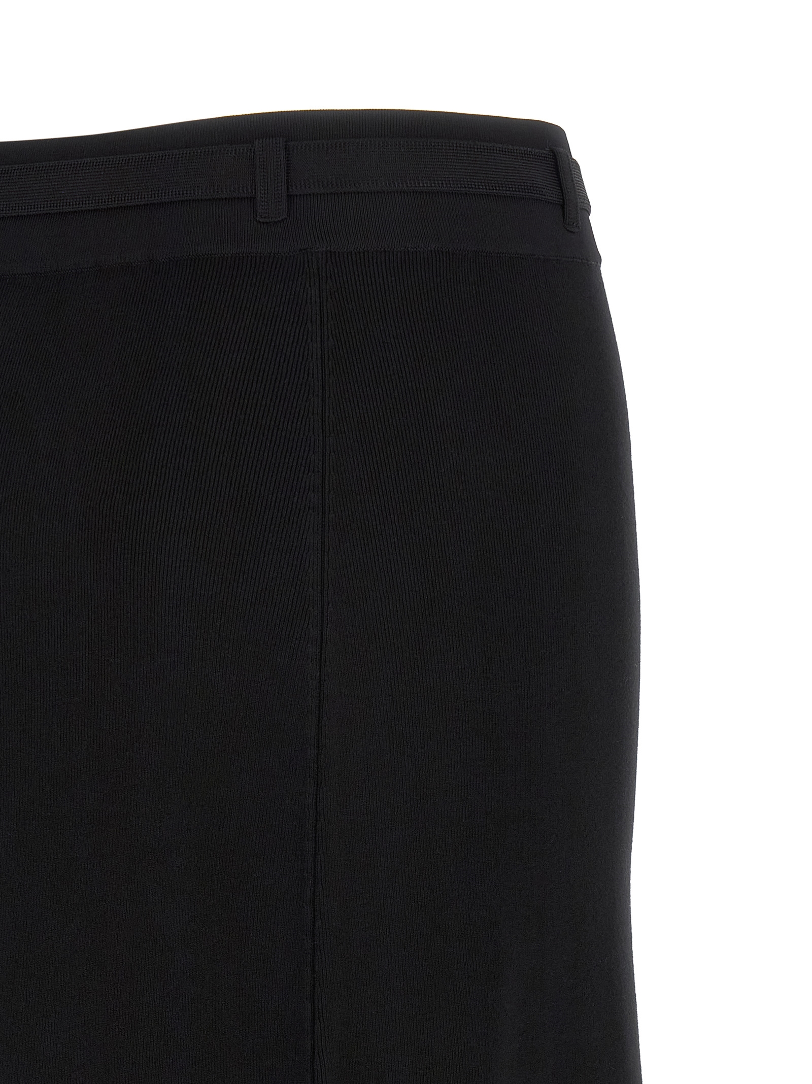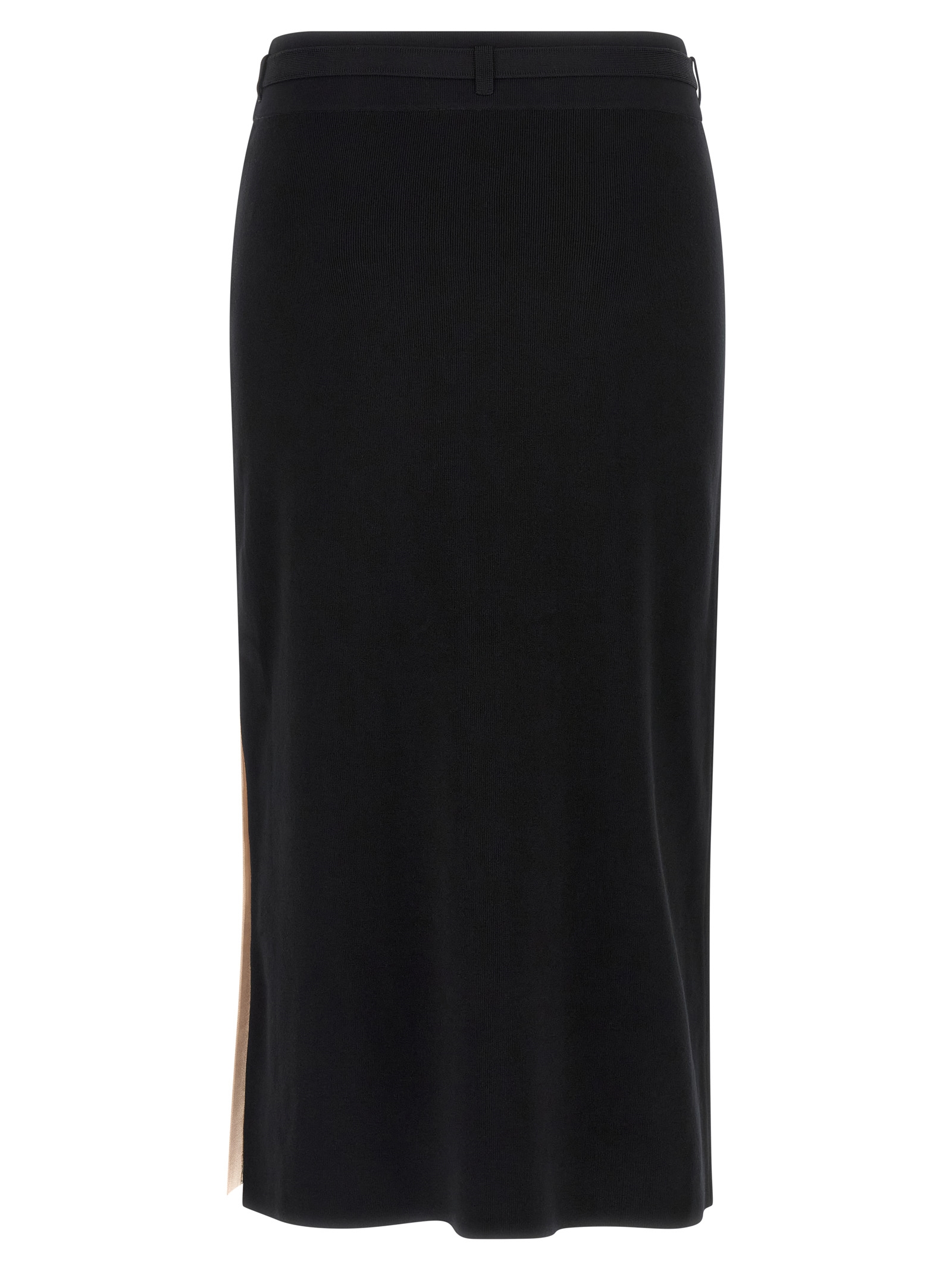 Midi knit skirt, side band in shiny viscose with jacquard logo and jewel buttons, high waist, elastic waistband with belt, side split.